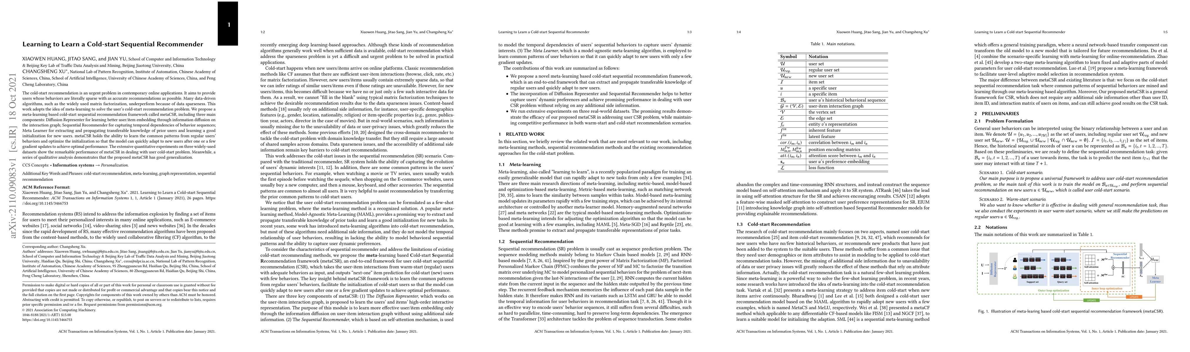This paper proposes metaCSR, a meta-learning based framework to tackle the cold-start recommendation problem by leveraging user/item embeddings, sequential behavior modeling, and knowledge transfer from prior users to quickly adapt to new users. Experimental results demonstrate metaCSR's superior performance and generalization ability.
