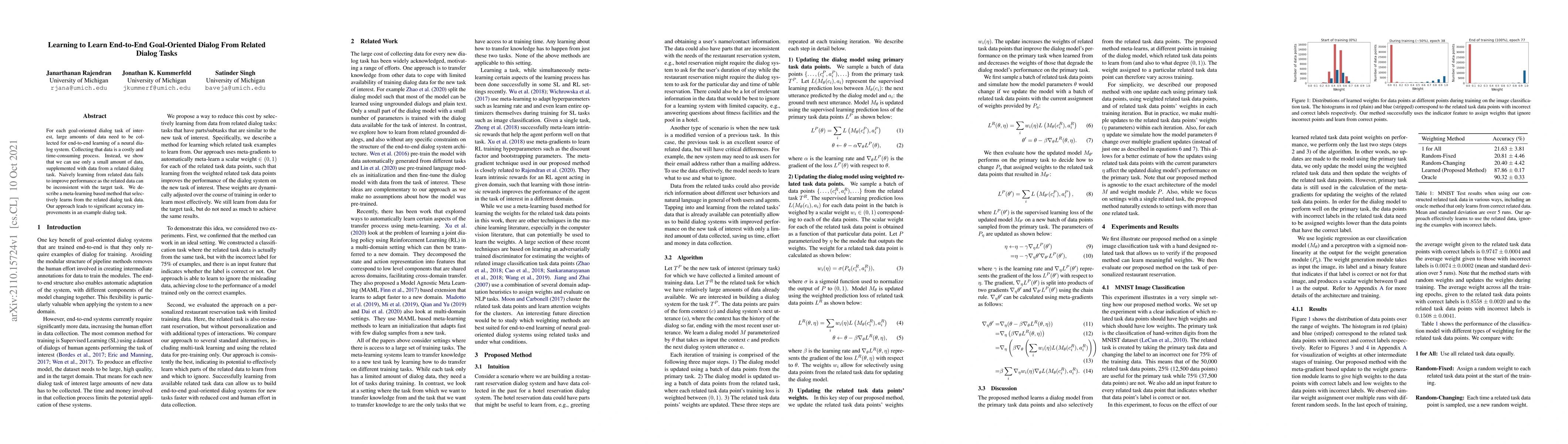 For each goal-oriented dialog task of interest, large amounts of data need to be collected for end-to-end learning of a neural dialog system. Collecting that data is a costly and time-consuming process. Instead, we show that we can use only a small amount of data, supplemented with data from a related dialog task. Naively learning from related data fails to improve performance as the related data can be inconsistent with the target task. We describe a meta-learning based method that selectively learns from the related dialog task data. Our approach leads to significant accuracy improvements in an example dialog task.