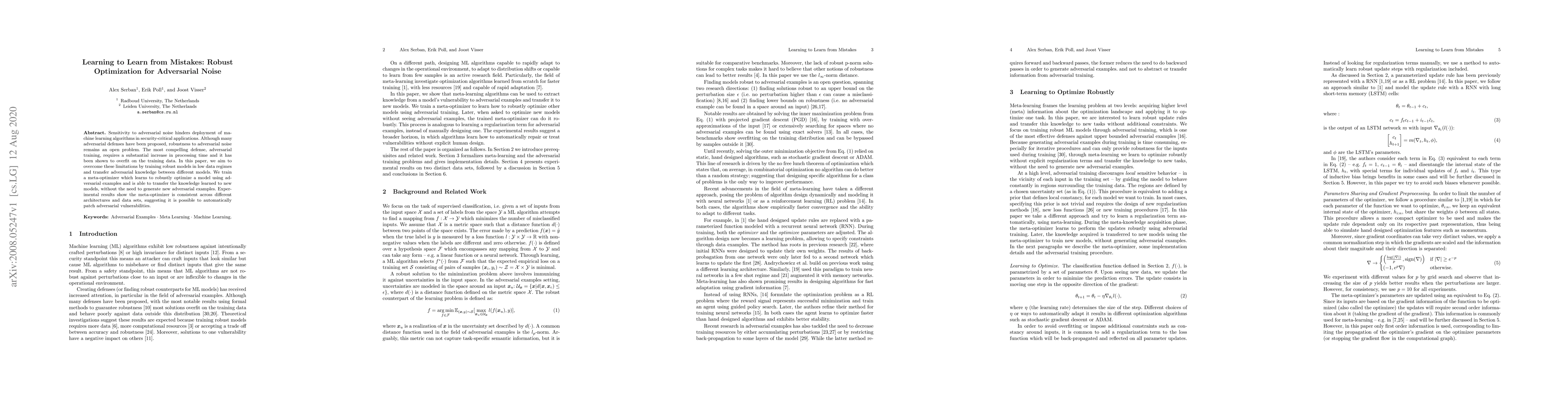 This paper proposes a meta-optimizer to enhance machine learning models' robustness against adversarial noise, enabling knowledge transfer between models without generating new adversarial examples. Experimental results show consistent performance across different architectures and datasets, indicating potential for automatic adversarial vulnerability patching.