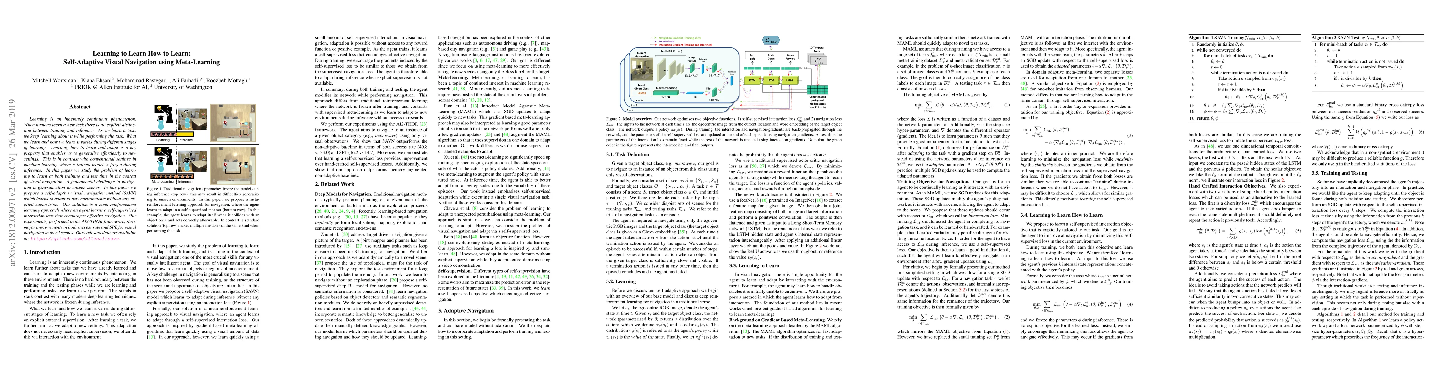 This paper proposes a self-adaptive visual navigation method (SAVN) that employs meta-reinforcement learning to enable an agent to learn how to learn and adapt to new environments without explicit supervision. Experiments in the AI2-THOR framework demonstrate significant improvements in navigation success rates and SPL in novel scenes.