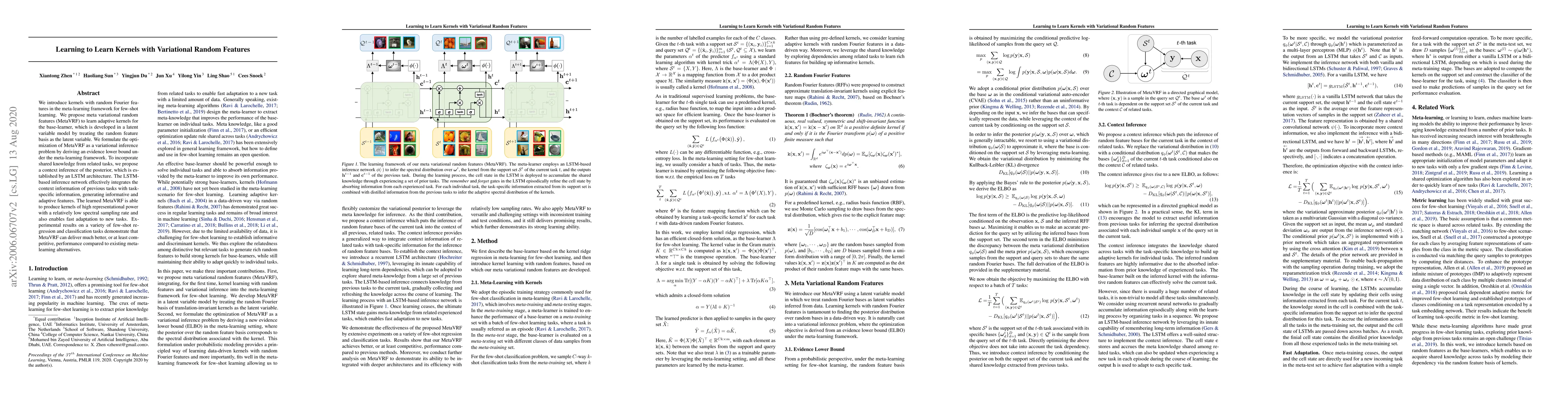This paper proposes MetaVRF, a meta-learning framework that uses variational random features to adaptively learn kernels for few-shot learning. It integrates context information from previous tasks using an LSTM to generate adaptive features, demonstrating superior performance in few-shot regression and classification tasks.