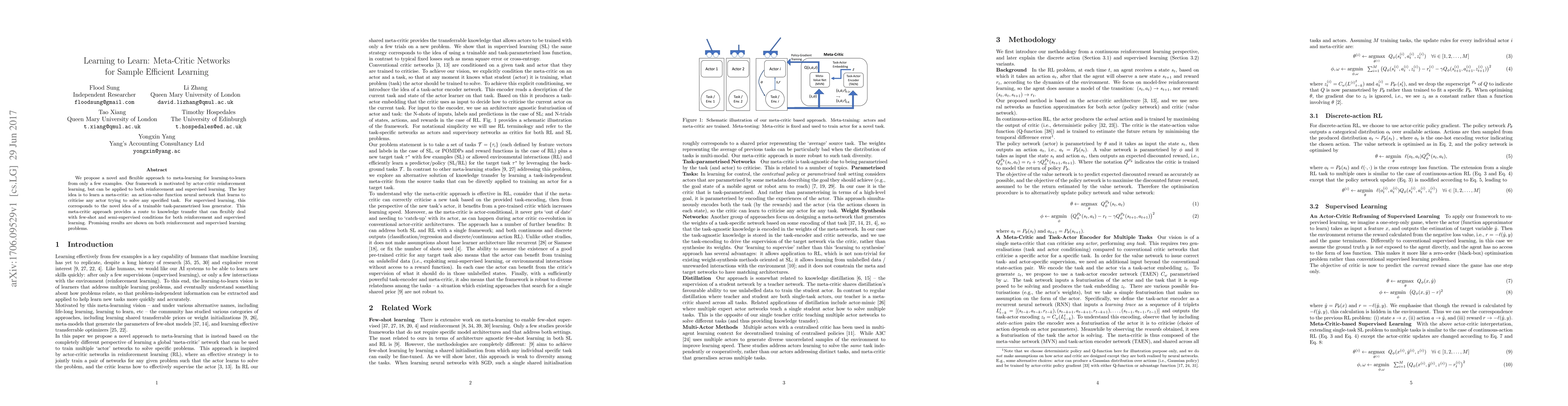 This paper introduces a meta-learning framework called Meta-Critic Networks that leverages an action-value function neural network to efficiently learn from few examples. It enables flexible knowledge transfer for both reinforcement and supervised learning, demonstrating promising results in few-shot and semi-supervised settings.