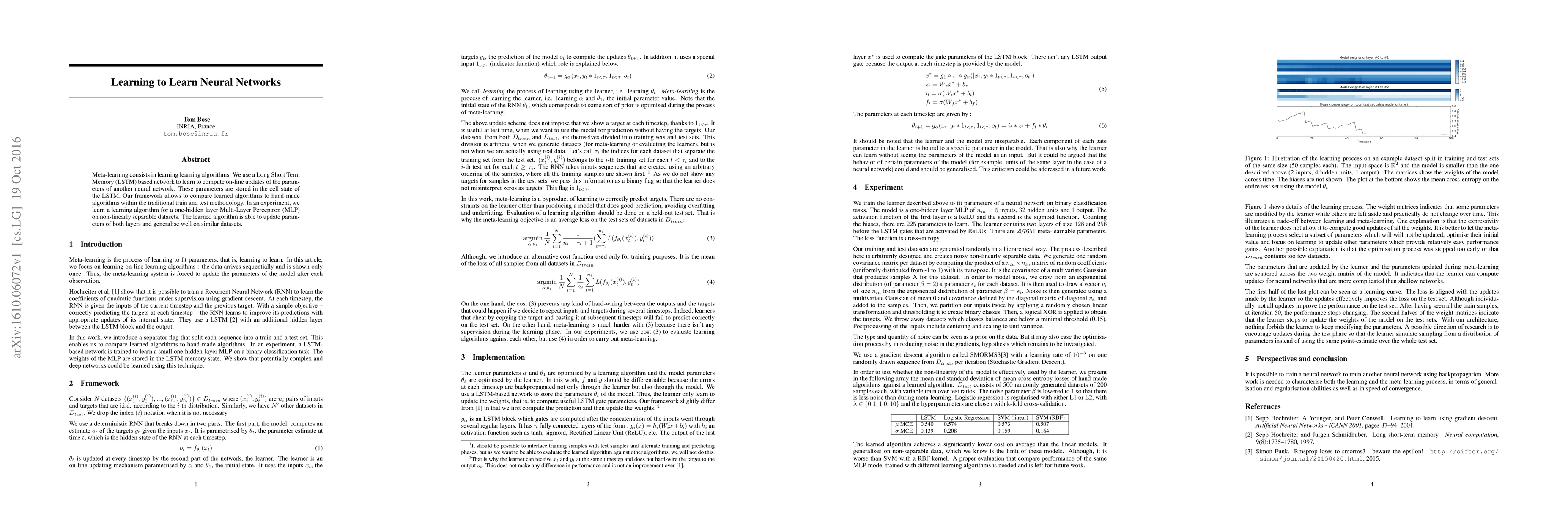 Meta-learning consists in learning learning algorithms. We use a Long Short Term Memory (LSTM) based network to learn to compute on-line updates of the parameters of another neural network. These parameters are stored in the cell state of the LSTM. Our framework allows to compare learned algorithms to hand-made algorithms within the traditional train and test methodology. In an experiment, we learn a learning algorithm for a one-hidden layer Multi-Layer Perceptron (MLP) on non-linearly separable datasets. The learned algorithm is able to update parameters of both layers and generalise well on similar datasets.