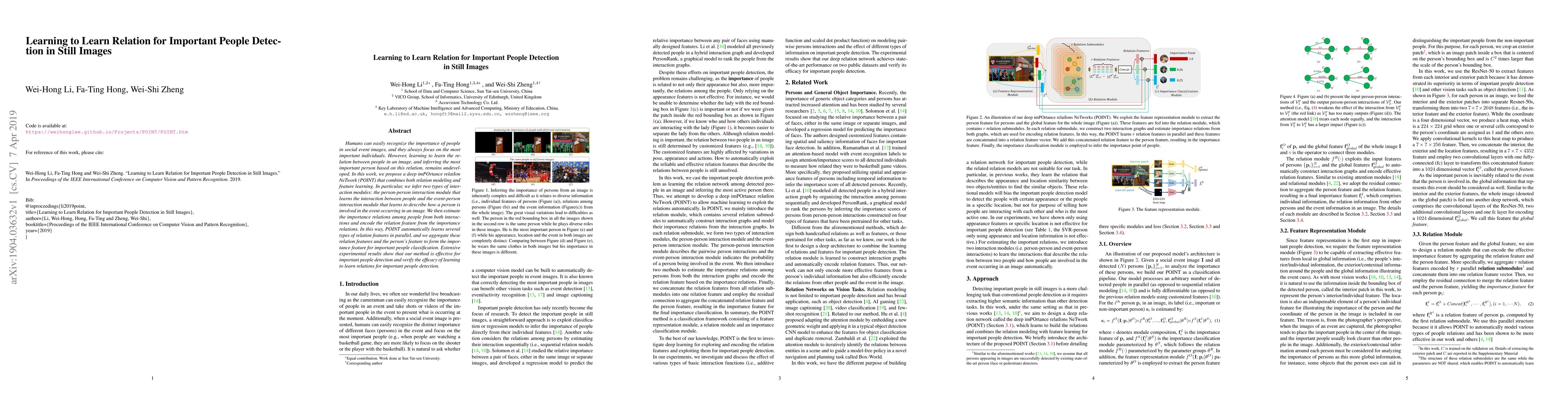 This paper proposes a deep learning framework called POINT to detect important people in social event images by modeling interactions between individuals and their involvement in events. The method combines person-person and event-person interaction modules to infer importance relations, which are then used to classify individuals based on their significance.