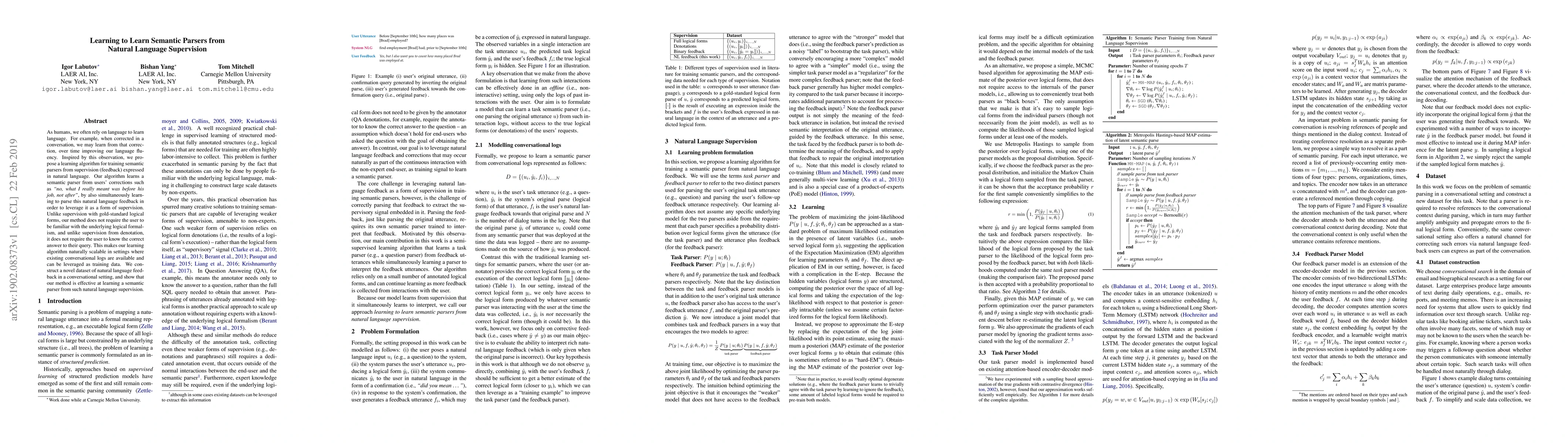 The paper proposes a learning algorithm for training semantic parsers from natural language supervision, utilizing users' corrections as feedback. It collects natural language feedback in isolation for each dialog turn using Mechanical Turk, summarizing the dialog context with entities for context-grounded interactions.