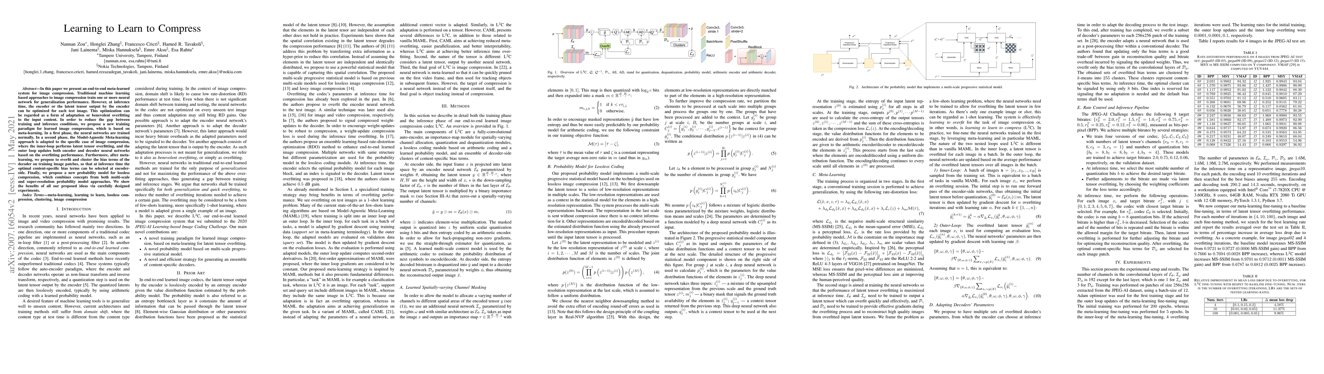 In this paper we present an end-to-end meta-learned system for image compression. Traditional machine learning based approaches to image compression train one or more neural network for generalization performance. However, at inference time, the encoder or the latent tensor output by the encoder can be optimized for each test image. This optimization can be regarded as a form of adaptation or benevolent overfitting to the input content. In order to reduce the gap between training and inference conditions, we propose a new training paradigm for learned image compression, which is based on meta-learning. In a first phase, the neural networks are trained normally. In a second phase, the Model-Agnostic Meta-learning approach is adapted to the specific case of image compression, where the inner-loop performs latent tensor overfitting, and the outer loop updates both encoder and decoder neural networks based on the overfitting performance. Furthermore, after meta-learning, we propose to overfit and cluster the bias terms of the decoder on training image patches, so that at inference time the optimal content-specific bias terms can be selected at encoder-side. Finally, we propose a new probability model for lossless compression, which combines concepts from both multi-scale and super-resolution probability model approaches. We show the benefits of all our proposed ideas via carefully designed experiments.