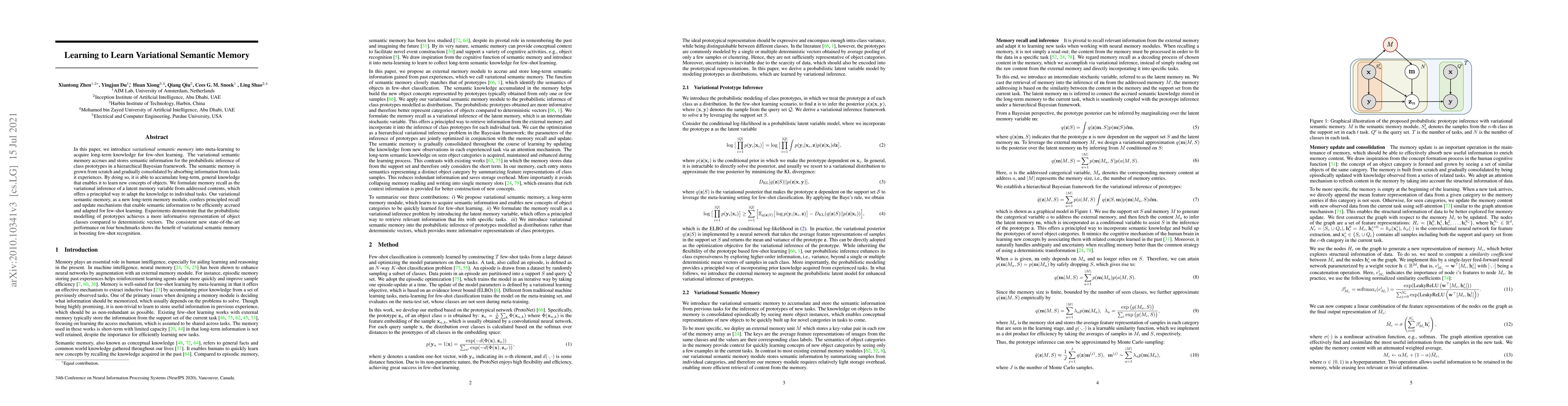 This paper proposes a variational semantic memory module for meta-learning to enhance few-shot learning by accumulating long-term, general knowledge through probabilistic inference. Experiments show improved representation of object classes and state-of-the-art performance on benchmarks.