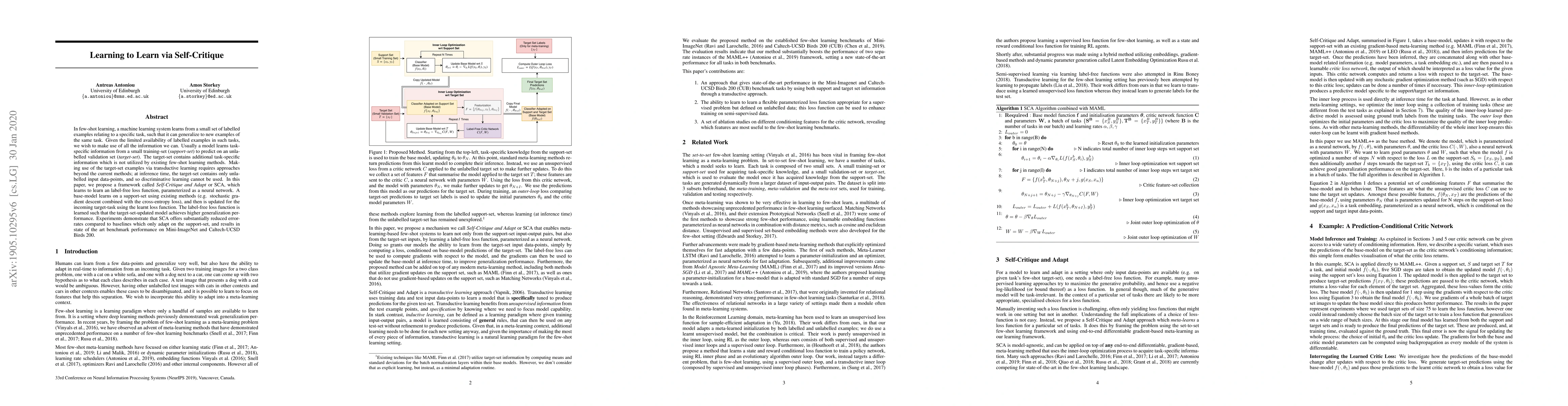 The paper proposes a framework called Self-Critique and Adapt (SCA) to improve few-shot learning by utilizing an unlabelled target-set. SCA learns a label-free loss function to update the base-model, achieving better generalization and state-of-the-art performance on Mini-ImageNet and Caltech-UCSD Birds 200 datasets.