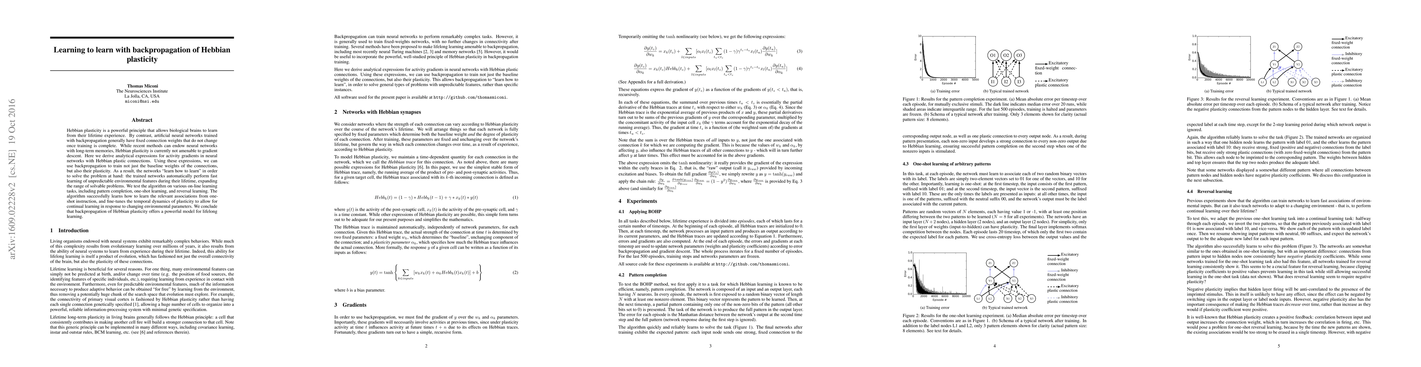 This paper proposes a method to integrate Hebbian plasticity into neural networks using backpropagation, enabling them to "learn how to learn" and adapt to new environmental features throughout their lifetime. The derived analytical expressions allow for the training of both connection weights and their plasticity, demonstrating successful application in tasks like pattern completion and one-shot learning.