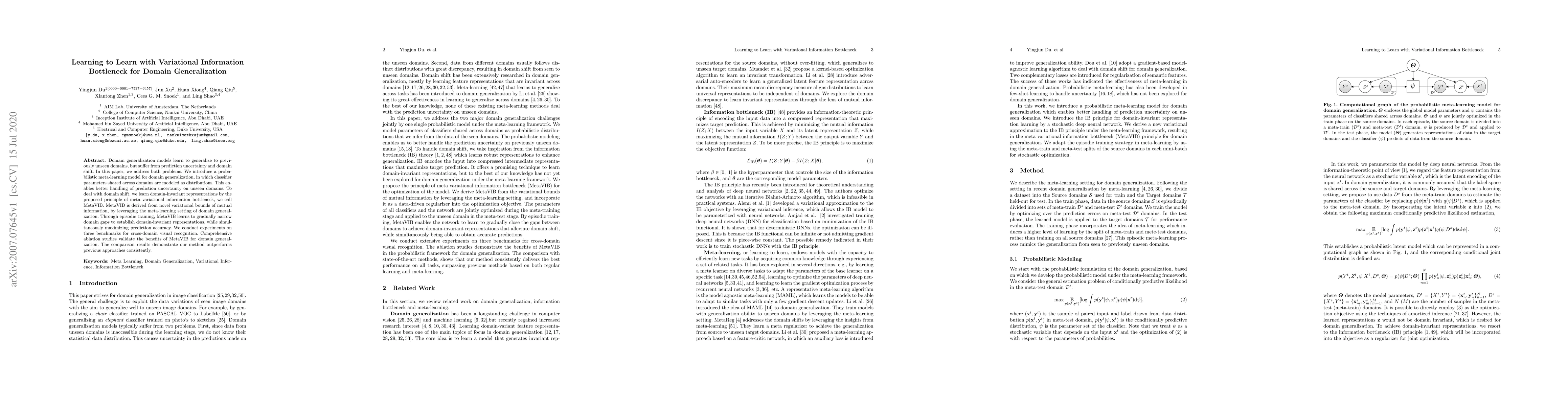 Domain generalization models learn to generalize to previously unseen domains, but suffer from prediction uncertainty and domain shift. In this paper, we address both problems. We introduce a probabilistic meta-learning model for domain generalization, in which classifier parameters shared across domains are modeled as distributions. This enables better handling of prediction uncertainty on unseen domains. To deal with domain shift, we learn domain-invariant representations by the proposed principle of meta variational information bottleneck, we call MetaVIB. MetaVIB is derived from novel variational bounds of mutual information, by leveraging the meta-learning setting of domain generalization. Through episodic training, MetaVIB learns to gradually narrow domain gaps to establish domain-invariant representations, while simultaneously maximizing prediction accuracy. We conduct experiments on three benchmarks for cross-domain visual recognition. Comprehensive ablation studies validate the benefits of MetaVIB for domain generalization. The comparison results demonstrate our method outperforms previous approaches consistently.