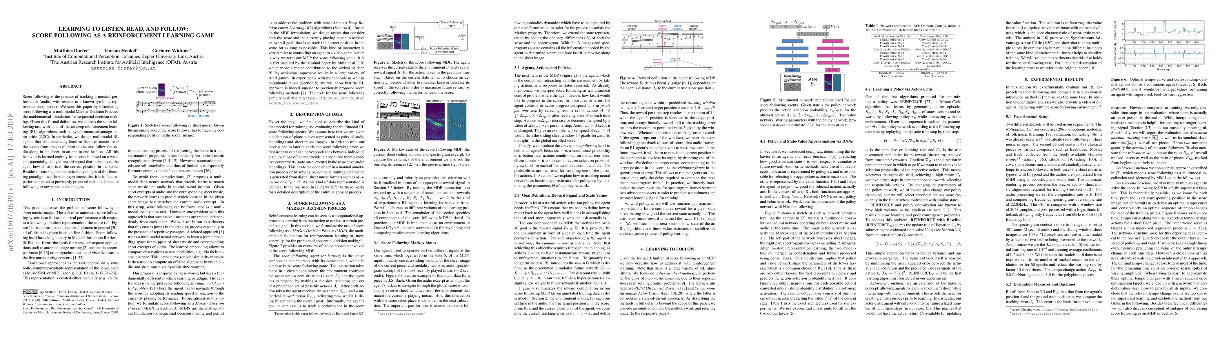 Score following is the process of tracking a musical performance (audio) with respect to a known symbolic representation (a score). We start this paper by formulating score following as a multimodal Markov Decision Process, the mathematical foundation for sequential decision making. Given this formal definition, we address the score following task with state-of-the-art deep reinforcement learning (RL) algorithms such as synchronous advantage actor critic (A2C). In particular, we design multimodal RL agents that simultaneously learn to listen to music, read the scores from images of sheet music, and follow the audio along in the sheet, in an end-to-end fashion. All this behavior is learned entirely from scratch, based on a weak and potentially delayed reward signal that indicates to the agent how close it is to the correct position in the score. Besides discussing the theoretical advantages of this learning paradigm, we show in experiments that it is in fact superior compared to previously proposed methods for score following in raw sheet music images.