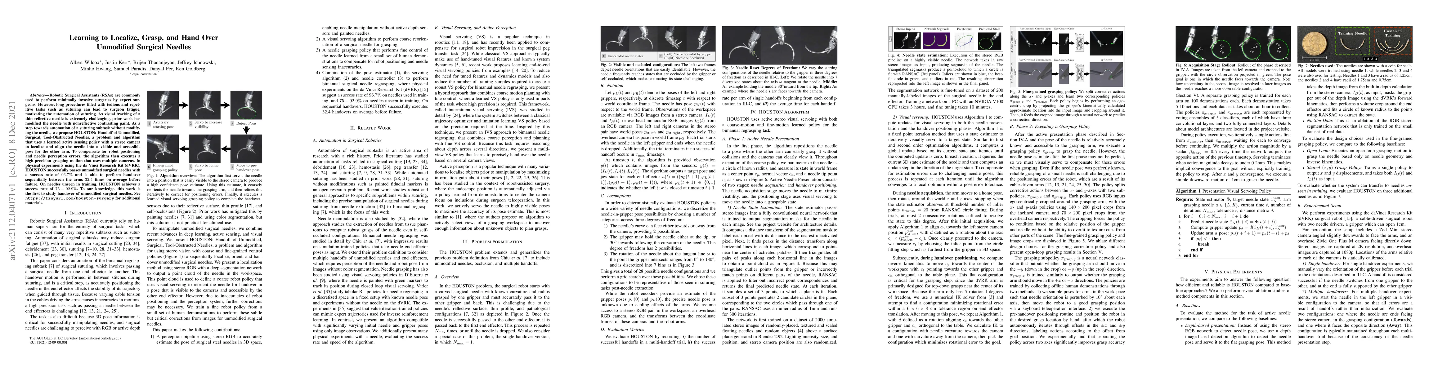 This paper proposes HOUSTON, an algorithm for robotically localizing, grasping, and handing over unmodified surgical needles without modifying them. Using a learned active sensing policy and multiple cameras, HOUSTON achieves a 96.7% success rate in physical experiments with the da Vinci Research Kit, marking a significant step towards automating suturing tasks in minimally invasive surgeries.