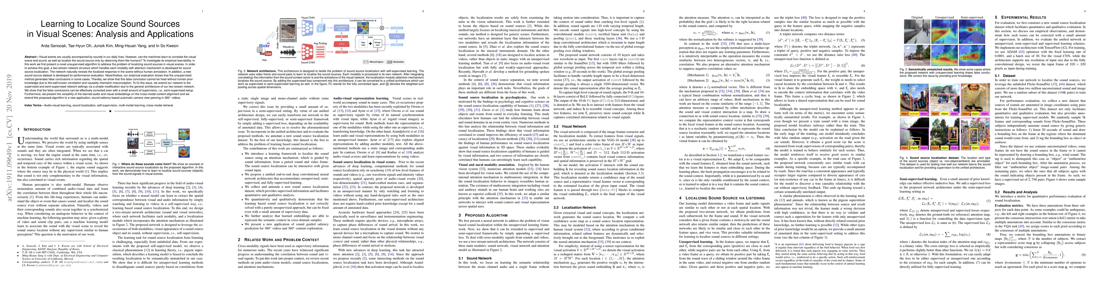 This paper presents an unsupervised algorithm for localizing sound sources in visual scenes using a two-stream network with attention mechanisms. The method reveals localized responses without human annotations but struggles with false conclusions due to correlation-causality mismatches, which are corrected via supervised and semi-supervised learning. The approach is also applied to sound saliency for automatic camera panning in 360-degree videos.
