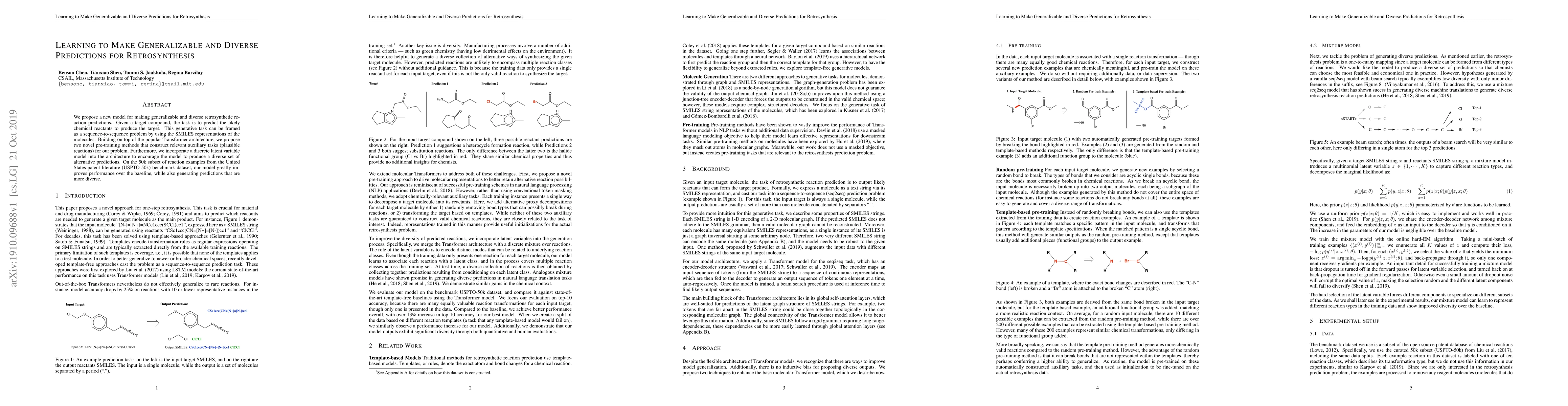 We propose a new model for making generalizable and diverse retrosynthetic reaction predictions. Given a target compound, the task is to predict the likely chemical reactants to produce the target. This generative task can be framed as a sequence-to-sequence problem by using the SMILES representations of the molecules. Building on top of the popular Transformer architecture, we propose two novel pre-training methods that construct relevant auxiliary tasks (plausible reactions) for our problem. Furthermore, we incorporate a discrete latent variable model into the architecture to encourage the model to produce a diverse set of alternative predictions. On the 50k subset of reaction examples from the United States patent literature (USPTO-50k) benchmark dataset, our model greatly improves performance over the baseline, while also generating predictions that are more diverse.