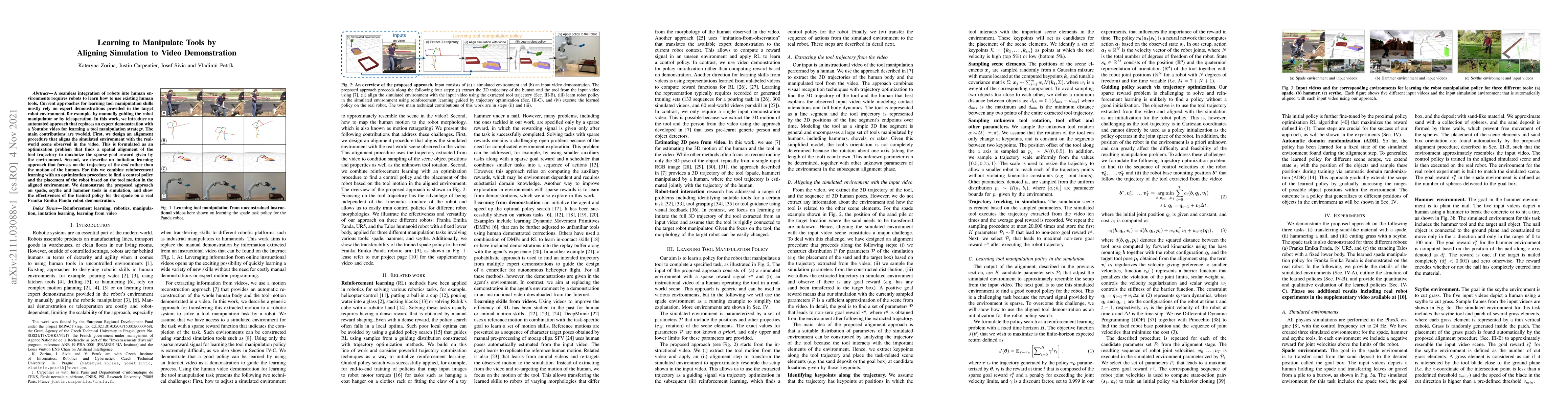 This paper presents an automated method for robots to learn tool manipulation by aligning simulation to video demonstrations from YouTube. It uses an optimization procedure to align simulated environments with real-world tool trajectories and combines reinforcement learning with optimization to develop a control policy based on tool motion.
