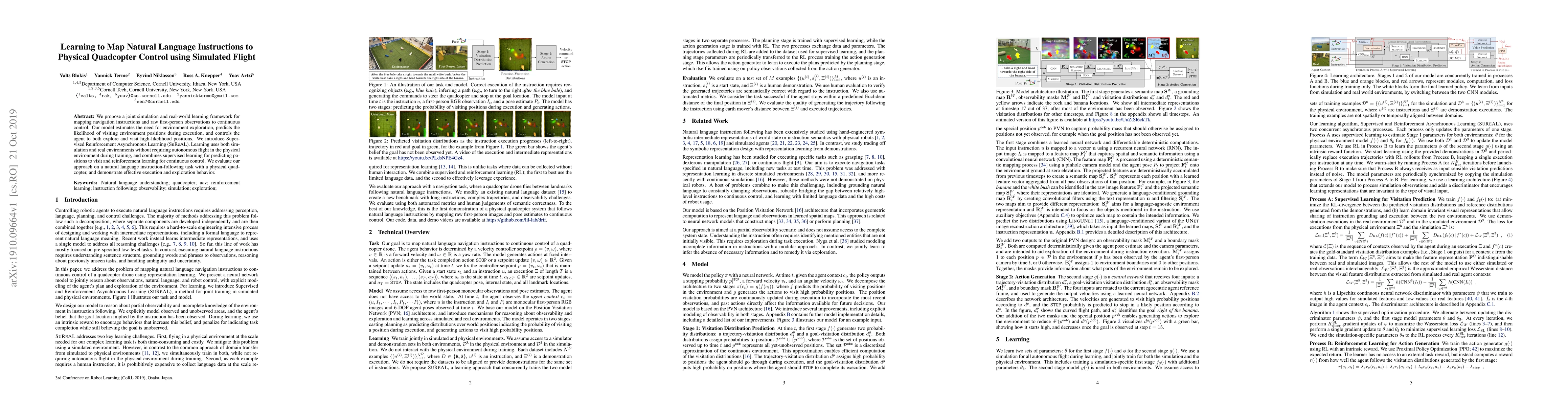 This paper presents a framework combining simulation and real-world learning to map natural language instructions to quadcopter control, using Supervised Reinforcement Asynchronous Learning (SuReAL). The model explores environments and predicts high-likelihood positions, demonstrating effective instruction-following and exploration in physical flight tests.