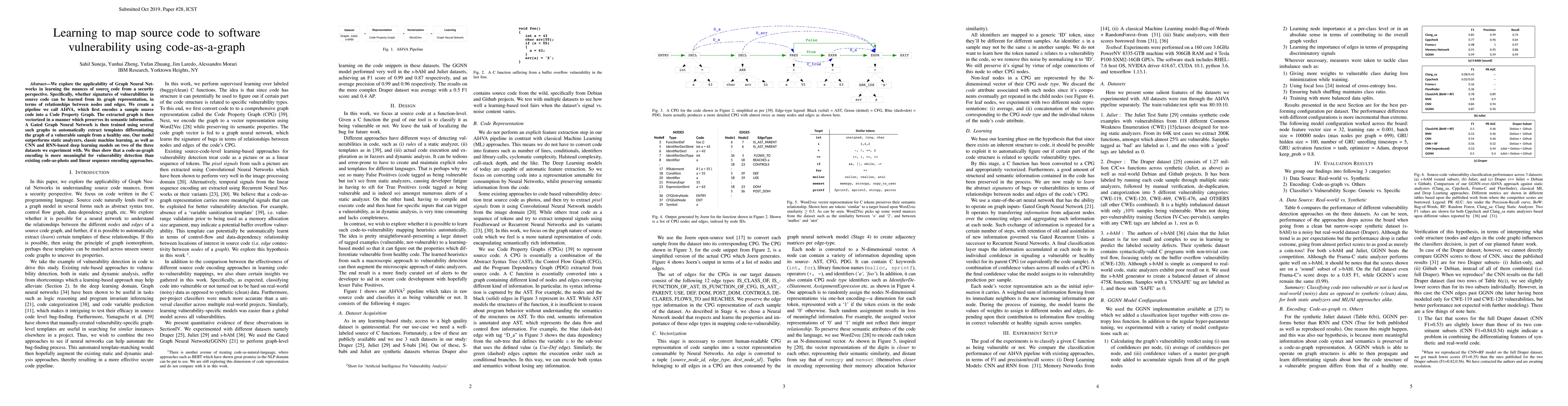 We explore the applicability of Graph Neural Networks in learning the nuances of source code from a security perspective. Specifically, whether signatures of vulnerabilities in source code can be learned from its graph representation, in terms of relationships between nodes and edges. We create a pipeline we call AI4VA, which first encodes a sample source code into a Code Property Graph. The extracted graph is then vectorized in a manner which preserves its semantic information. A Gated Graph Neural Network is then trained using several such graphs to automatically extract templates differentiating the graph of a vulnerable sample from a healthy one. Our model outperforms static analyzers, classic machine learning, as well as CNN and RNN-based deep learning models on two of the three datasets we experiment with. We thus show that a code-as-graph encoding is more meaningful for vulnerability detection than existing code-as-photo and linear sequence encoding approaches. (Submitted Oct 2019, Paper #28, ICST)