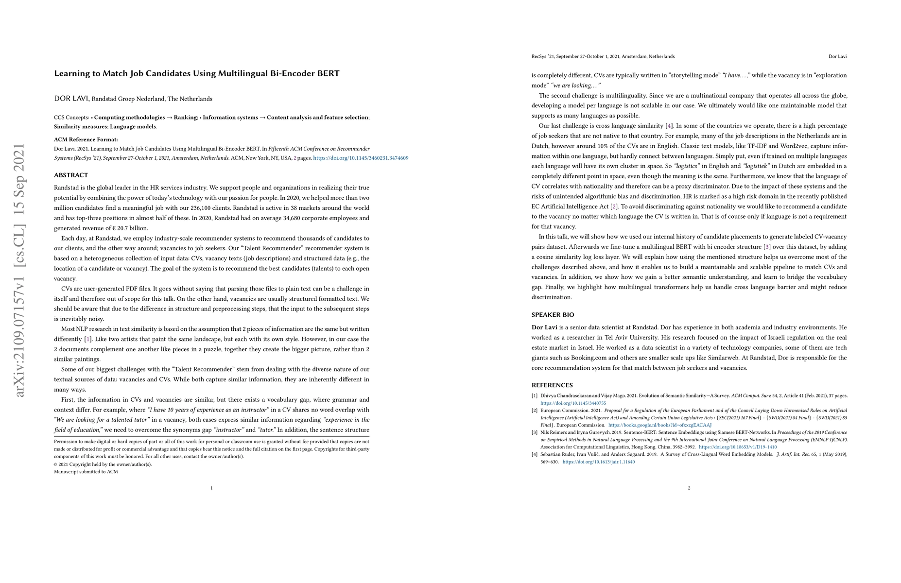 In this talk, we will show how we used Randstad history of candidate placements to generate labeled CV-vacancy pairs dataset. Afterwards we fine-tune a multilingual BERT with bi encoder structure over this dataset, by adding a cosine similarity log loss layer. We will explain how using the mentioned structure helps us overcome most of the challenges described above, and how it enables us to build a maintainable and scalable pipeline to match CVs and vacancies. In addition, we show how we gain a better semantic understanding, and learn to bridge the vocabulary gap. Finally, we highlight how multilingual transformers help us handle cross language barrier and might reduce discrimination.