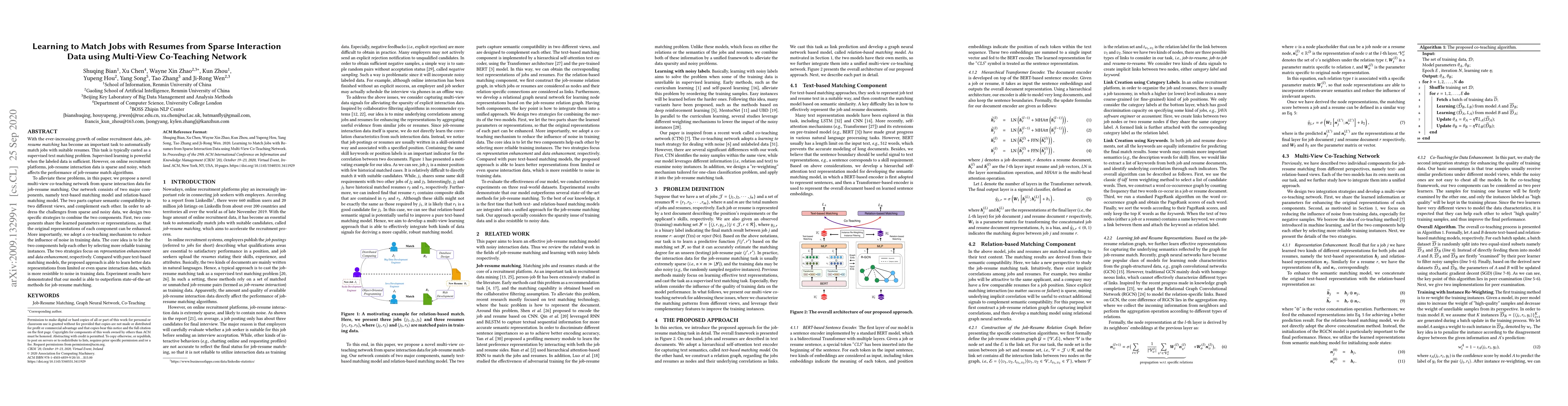 This paper proposes a multi-view co-teaching network to match jobs with resumes using sparse interaction data, combining text-based and relation-based models to enhance representation and reduce noise. The approach outperforms state-of-the-art methods in job-resume matching.