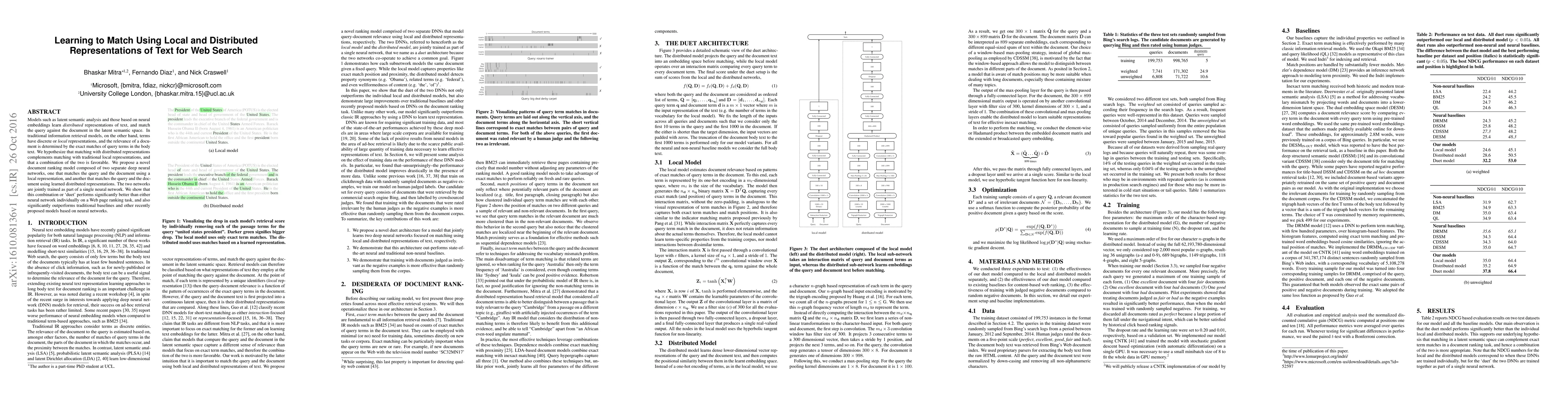 A new document ranking model combines local and distributed representations of text to improve web search results, outperforming traditional methods and existing neural network models.