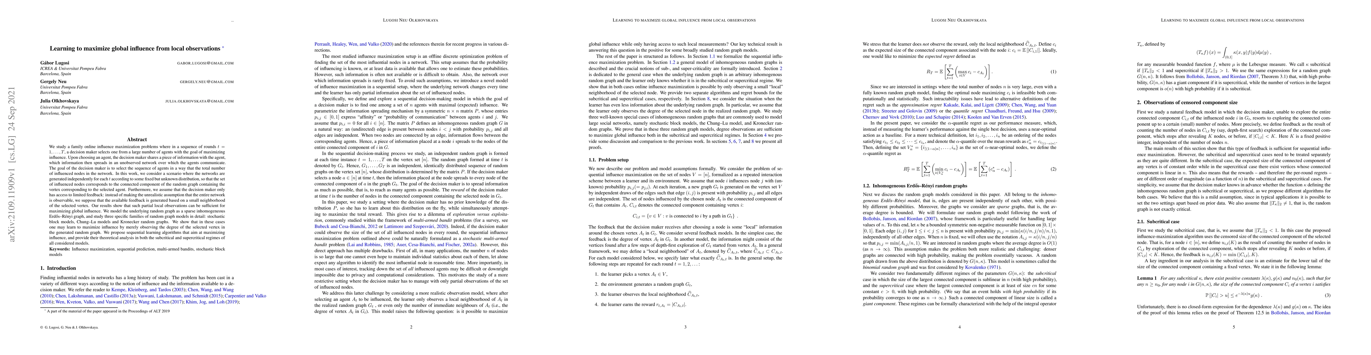 We study a family online influence maximization problems where in a sequence of rounds $t=1,\ldots,T$, a decision maker selects one from a large number of agents with the goal of maximizing influence. Upon choosing an agent, the decision maker shares a piece of information with the agent, which information then spreads in an unobserved network over which the agents communicate. The goal of the decision maker is to select the sequence of agents in a way that the total number of influenced nodes in the network. In this work, we consider a scenario where the networks are generated independently for each $t$ according to some fixed but unknown distribution, so that the set of influenced nodes corresponds to the connected component of the random graph containing the vertex corresponding to the selected agent. Furthermore, we assume that the decision maker only has access to limited feedback: instead of making the unrealistic assumption that the entire network is observable, we suppose that the available feedback is generated based on a small neighborhood of the selected vertex. Our results show that such partial local observations can be sufficient for maximizing global influence. We model the underlying random graph as a sparse inhomogeneous Erd\H{o}s--R\'enyi graph, and study three specific families of random graph models in detail: stochastic block models, Chung--Lu models and Kronecker random graphs. We show that in these cases one may learn to maximize influence by merely observing the degree of the selected vertex in the generated random graph. We propose sequential learning algorithms that aim at maximizing influence, and provide their theoretical analysis in both the subcritical and supercritical regimes of all considered models.