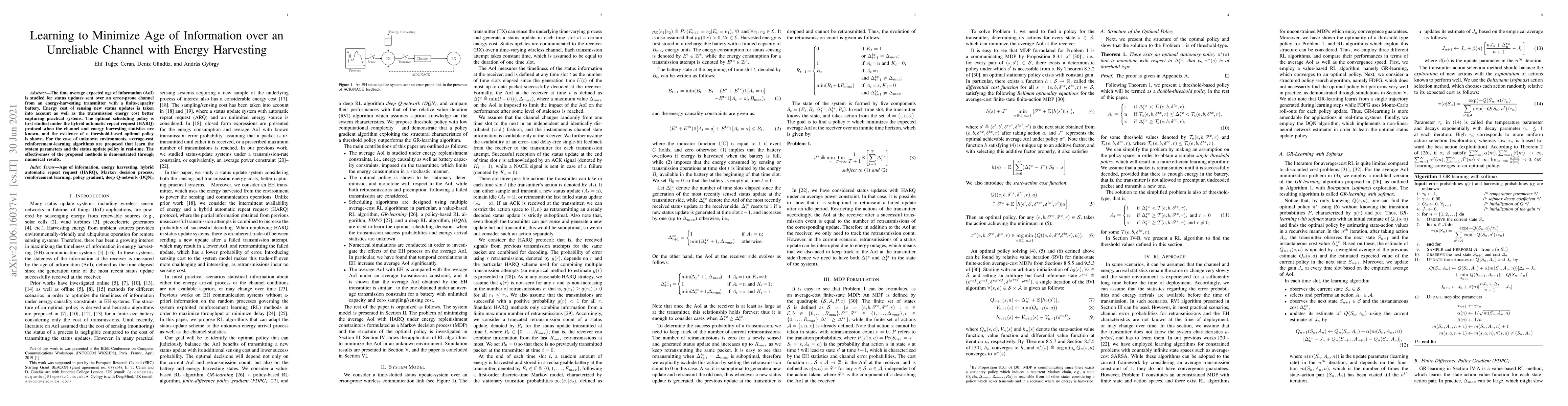 The time average expected age of information (AoI) is studied for status updates sent over an error-prone channel from an energy-harvesting transmitter with a finite-capacity battery. Energy cost of sensing new status updates is taken into account as well as the transmission energy cost better capturing practical systems. The optimal scheduling policy is first studied under the hybrid automatic repeat request (HARQ) protocol when the channel and energy harvesting statistics are known, and the existence of a threshold-based optimal policy is shown. For the case of unknown environments, average-cost reinforcement-learning algorithms are proposed that learn the system parameters and the status update policy in real-time. The effectiveness of the proposed methods is demonstrated through numerical results.
