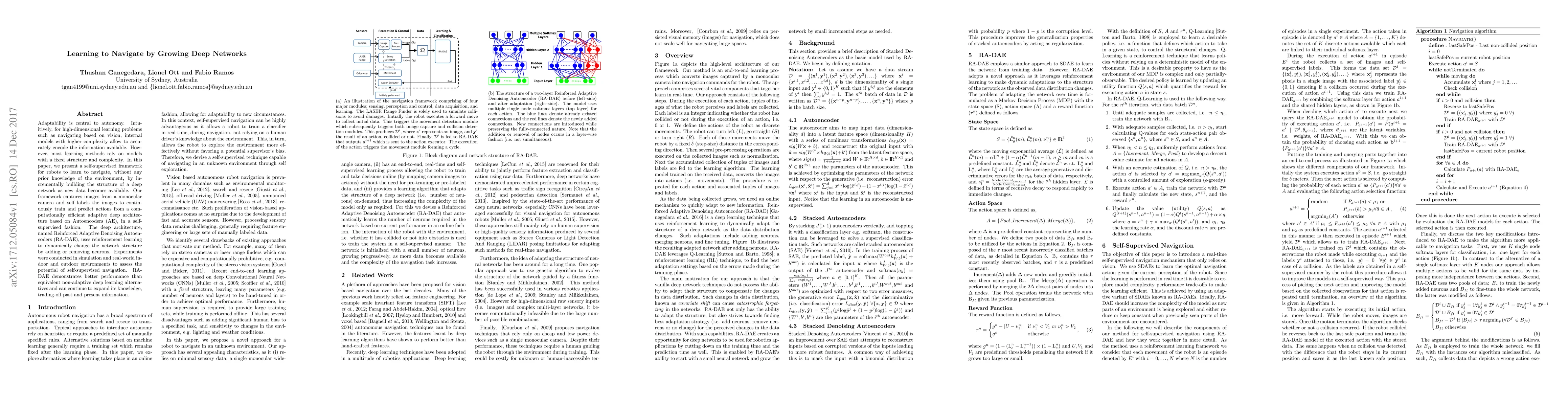 Adaptability is central to autonomy. Intuitively, for high-dimensional learning problems such as navigating based on vision, internal models with higher complexity allow to accurately encode the information available. However, most learning methods rely on models with a fixed structure and complexity. In this paper, we present a self-supervised framework for robots to learn to navigate, without any prior knowledge of the environment, by incrementally building the structure of a deep network as new data becomes available. Our framework captures images from a monocular camera and self labels the images to continuously train and predict actions from a computationally efficient adaptive deep architecture based on Autoencoders (AE), in a self-supervised fashion. The deep architecture, named Reinforced Adaptive Denoising Autoencoders (RA-DAE), uses reinforcement learning to dynamically change the network structure by adding or removing neurons. Experiments were conducted in simulation and real-world indoor and outdoor environments to assess the potential of self-supervised navigation. RA-DAE demonstrates better performance than equivalent non-adaptive deep learning alternatives and can continue to expand its knowledge, trading-off past and present information.