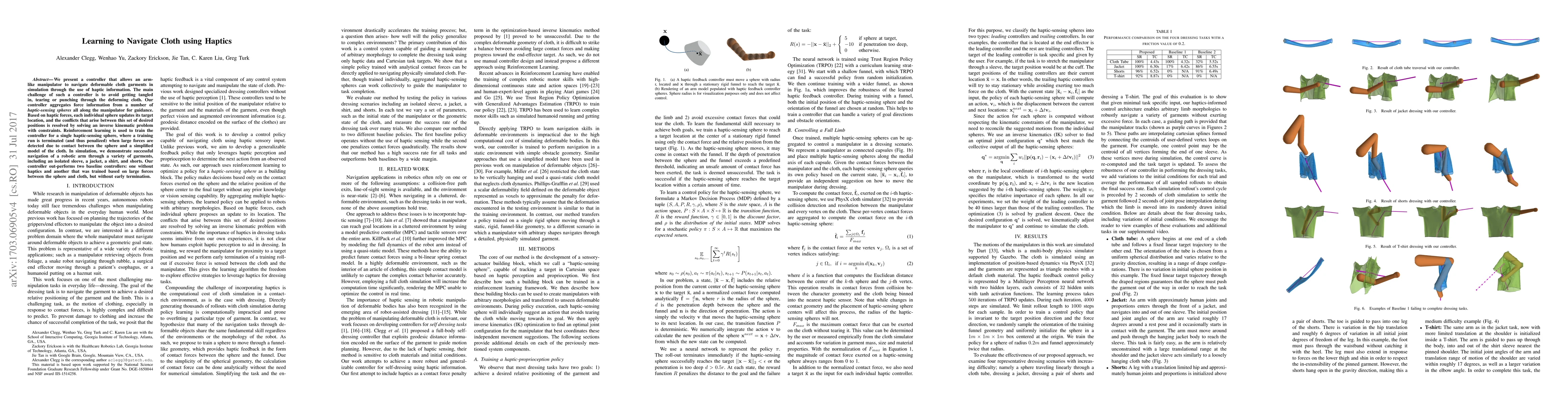 Researchers developed a controller that uses haptic feedback to navigate an arm-like manipulator through deformable cloth garments in simulation, achieving successful navigation of various garments.