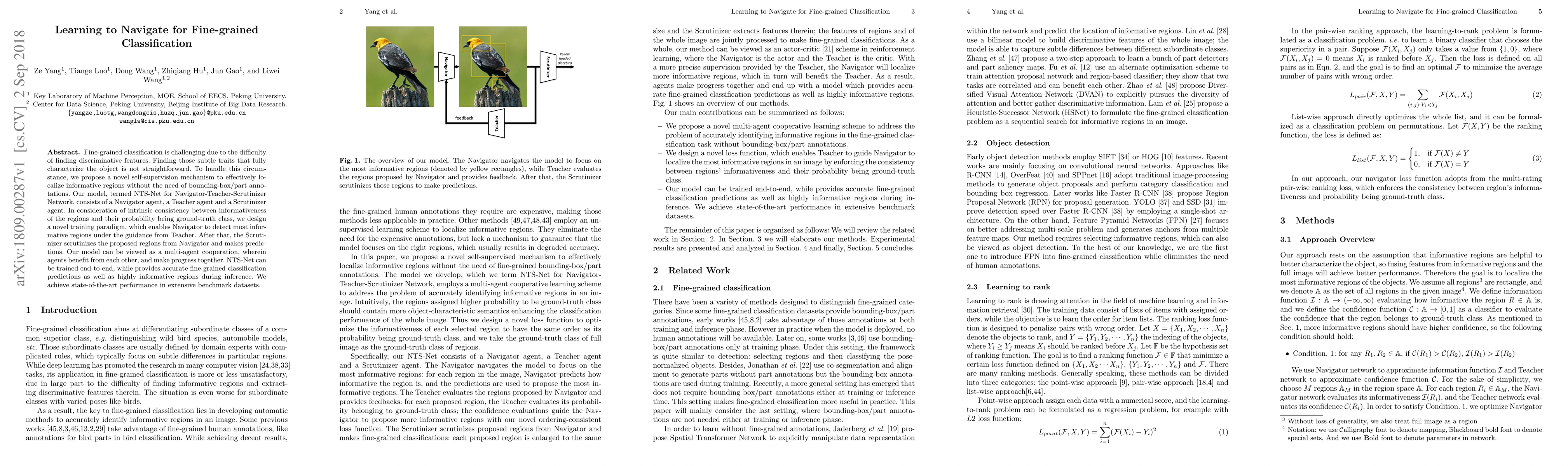 Fine-grained classification is challenging due to the difficulty of finding discriminative features. Finding those subtle traits that fully characterize the object is not straightforward. To handle this circumstance, we propose a novel self-supervision mechanism to effectively localize informative regions without the need of bounding-box/part annotations. Our model, termed NTS-Net for Navigator-Teacher-Scrutinizer Network, consists of a Navigator agent, a Teacher agent and a Scrutinizer agent. In consideration of intrinsic consistency between informativeness of the regions and their probability being ground-truth class, we design a novel training paradigm, which enables Navigator to detect most informative regions under the guidance from Teacher. After that, the Scrutinizer scrutinizes the proposed regions from Navigator and makes predictions. Our model can be viewed as a multi-agent cooperation, wherein agents benefit from each other, and make progress together. NTS-Net can be trained end-to-end, while provides accurate fine-grained classification predictions as well as highly informative regions during inference. We achieve state-of-the-art performance in extensive benchmark datasets.