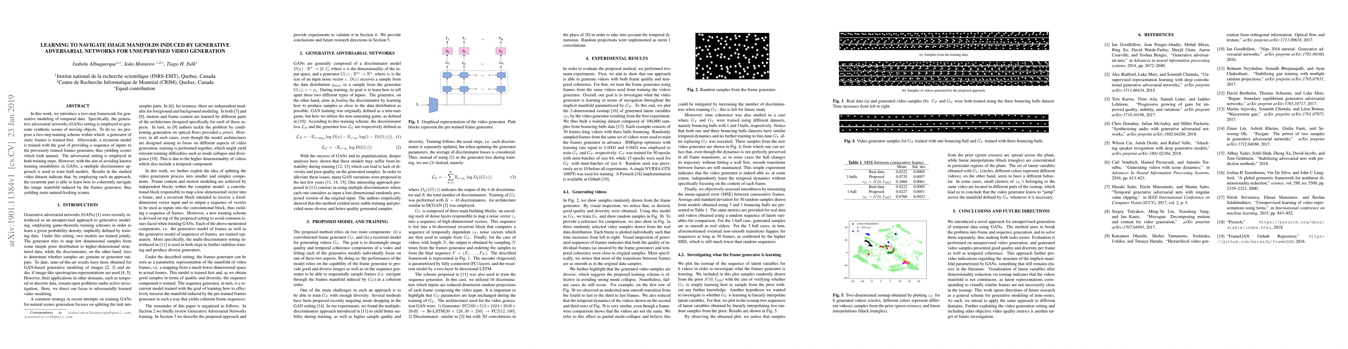 In this work, we introduce a two-step framework for generative modeling of temporal data. Specifically, the generative adversarial networks (GANs) setting is employed to generate synthetic scenes of moving objects. To do so, we propose a two-step training scheme within which: a generator of static frames is trained first. Afterwards, a recurrent model is trained with the goal of providing a sequence of inputs to the previously trained frames generator, thus yielding scenes which look natural. The adversarial setting is employed in both training steps. However, with the aim of avoiding known training instabilities in GANs, a multiple discriminator approach is used to train both models. Results in the studied video dataset indicate that, by employing such an approach, the recurrent part is able to learn how to coherently navigate the image manifold induced by the frames generator, thus yielding more natural-looking scenes.