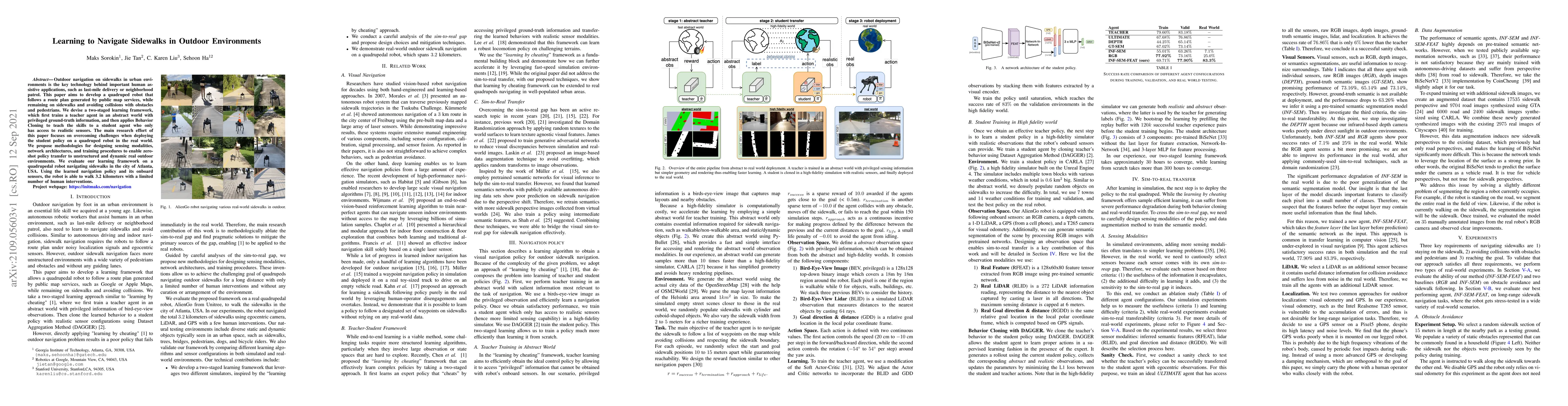 Outdoor navigation on sidewalks in urban environments is the key technology behind important human assistive applications, such as last-mile delivery or neighborhood patrol. This paper aims to develop a quadruped robot that follows a route plan generated by public map services, while remaining on sidewalks and avoiding collisions with obstacles and pedestrians. We devise a two-staged learning framework, which first trains a teacher agent in an abstract world with privileged ground-truth information, and then applies Behavior Cloning to teach the skills to a student agent who only has access to realistic sensors. The main research effort of this paper focuses on overcoming challenges when deploying the student policy on a quadruped robot in the real world. We propose methodologies for designing sensing modalities, network architectures, and training procedures to enable zero-shot policy transfer to unstructured and dynamic real outdoor environments. We evaluate our learning framework on a quadrupedal robot navigating sidewalks in the city of Atlanta, USA. Using the learned navigation policy and its onboard sensors, the robot is able to walk 3.2 kilometers with a limited number of human interventions.