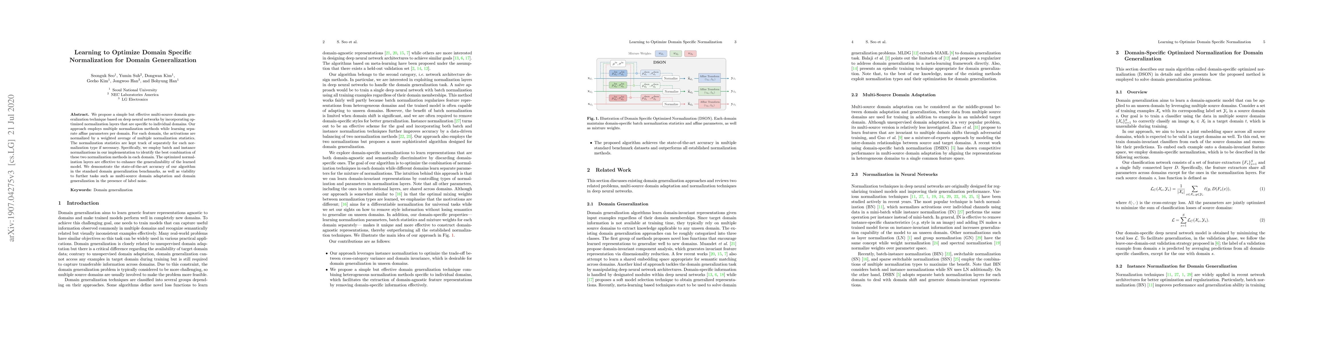 This paper proposes a multi-source domain generalization technique using deep neural networks with optimized domain-specific normalization layers. It employs batch and instance normalizations to enhance model generalizability, achieving state-of-the-art accuracy on domain generalization benchmarks.