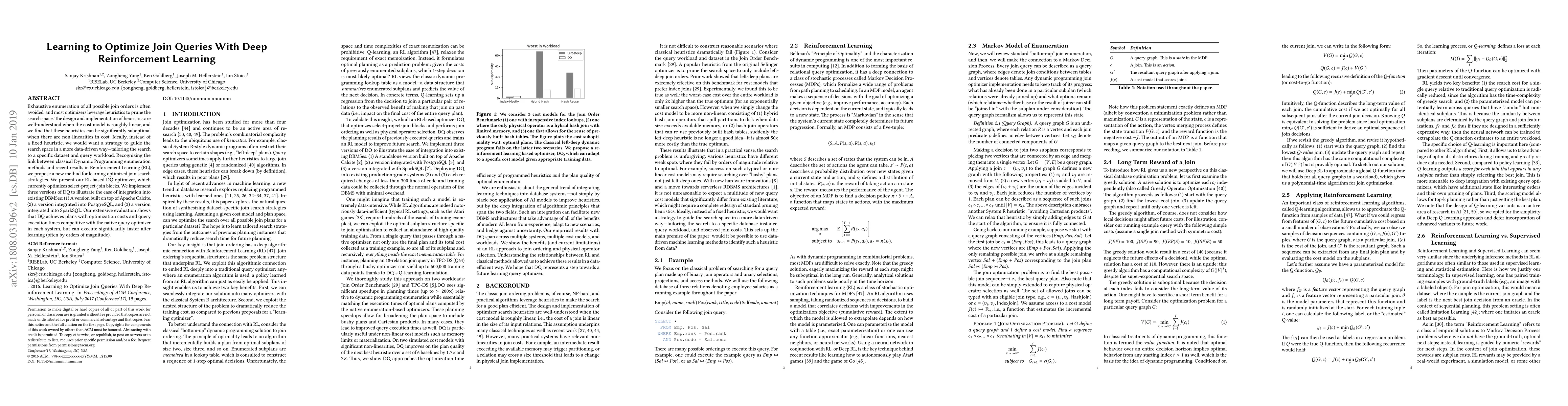 This paper proposes a deep reinforcement learning approach to optimize join queries by learning join search strategies tailored to specific datasets and query workloads, achieving competitive optimization costs and query execution times compared to native optimizers. The RL-based DQ optimizer is integrated into Apache Calcite, PostgreSQL, and SparkSQL, demonstrating significant speedups after learning.