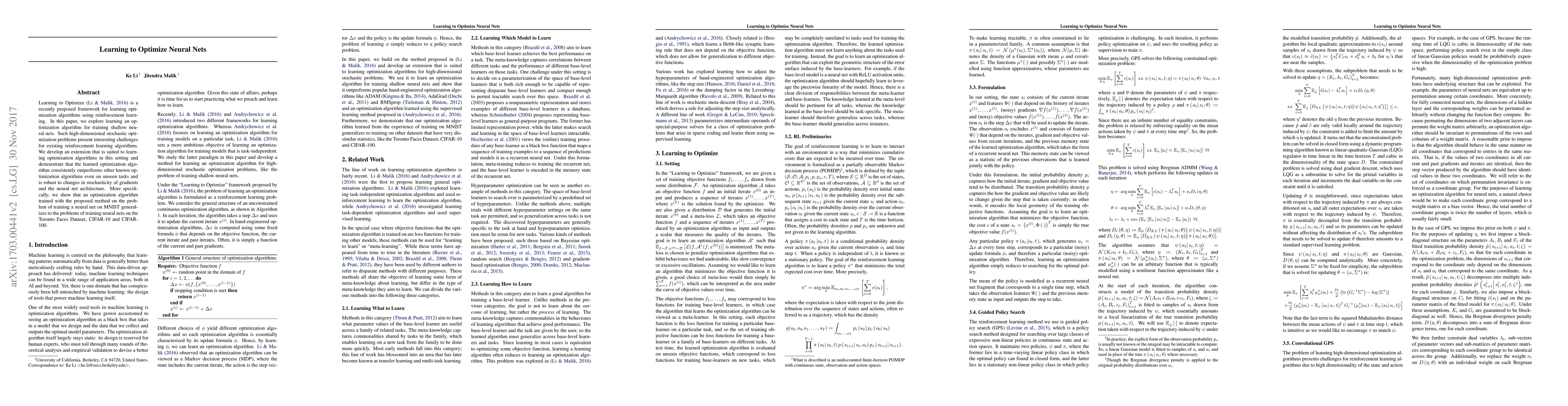 This paper explores reinforcement learning to develop an optimization algorithm for training shallow neural nets, showing it outperforms existing methods on various datasets and generalizes well to new tasks. The proposed method is robust to changes in gradient stochasticity and neural network architecture.