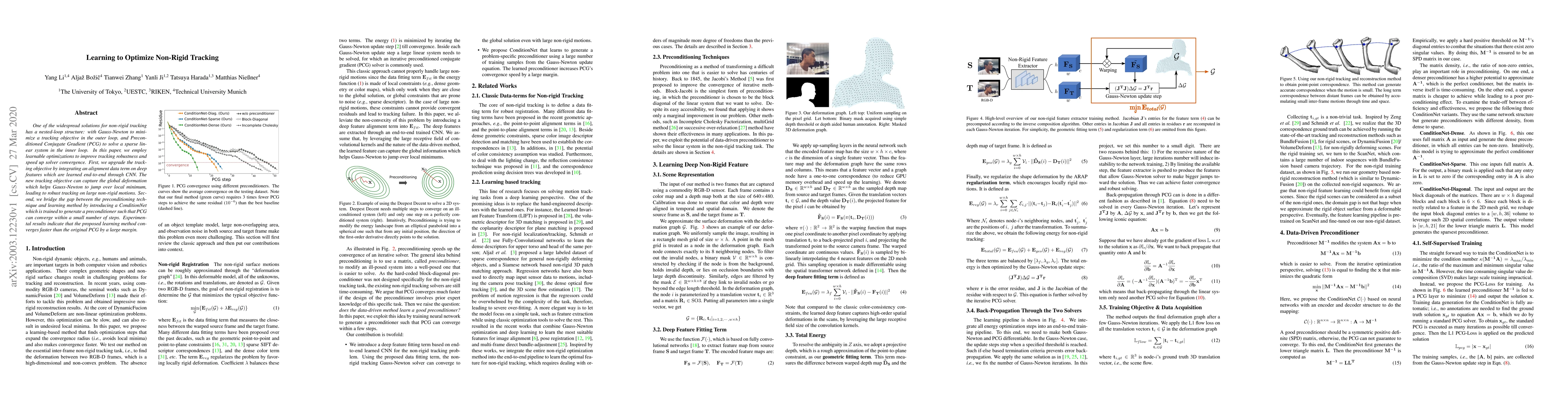 This paper proposes learnable optimizations to enhance non-rigid tracking by integrating deep features into the tracking objective and introducing a ConditionNet to generate preconditioners for faster solver convergence. The method improves robustness and speeds up tracking on large deformations.