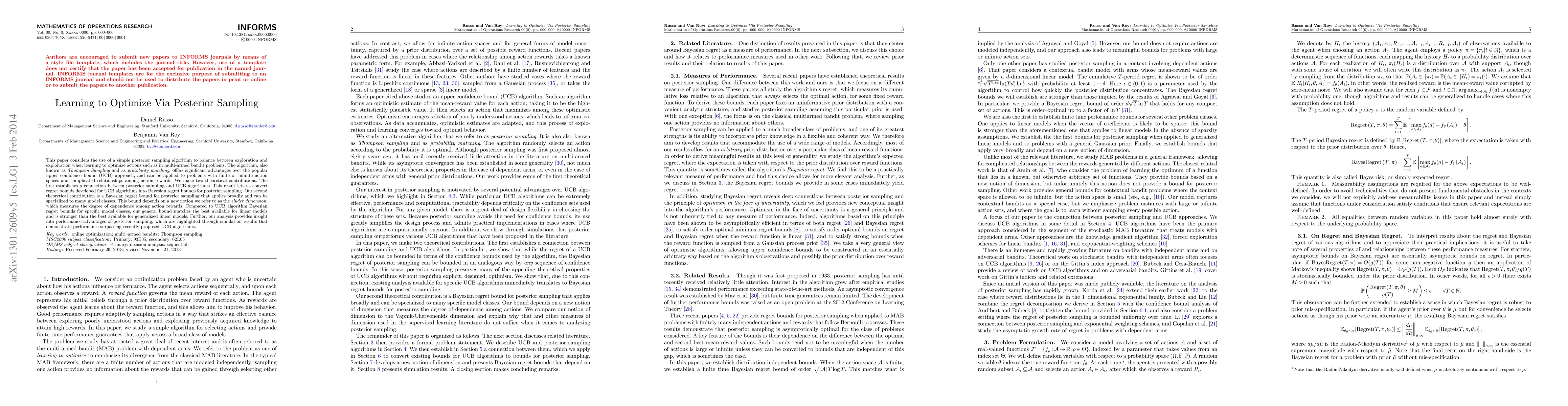 This paper considers the use of a simple posterior sampling algorithm to balance between exploration and exploitation when learning to optimize actions such as in multi-armed bandit problems. The algorithm, also known as Thompson Sampling, offers significant advantages over the popular upper confidence bound (UCB) approach, and can be applied to problems with finite or infinite action spaces and complicated relationships among action rewards. We make two theoretical contributions. The first establishes a connection between posterior sampling and UCB algorithms. This result lets us convert regret bounds developed for UCB algorithms into Bayesian regret bounds for posterior sampling. Our second theoretical contribution is a Bayesian regret bound for posterior sampling that applies broadly and can be specialized to many model classes. This bound depends on a new notion we refer to as the eluder dimension, which measures the degree of dependence among action rewards. Compared to UCB algorithm Bayesian regret bounds for specific model classes, our general bound matches the best available for linear models and is stronger than the best available for generalized linear models. Further, our analysis provides insight into performance advantages of posterior sampling, which are highlighted through simulation results that demonstrate performance surpassing recently proposed UCB algorithms.