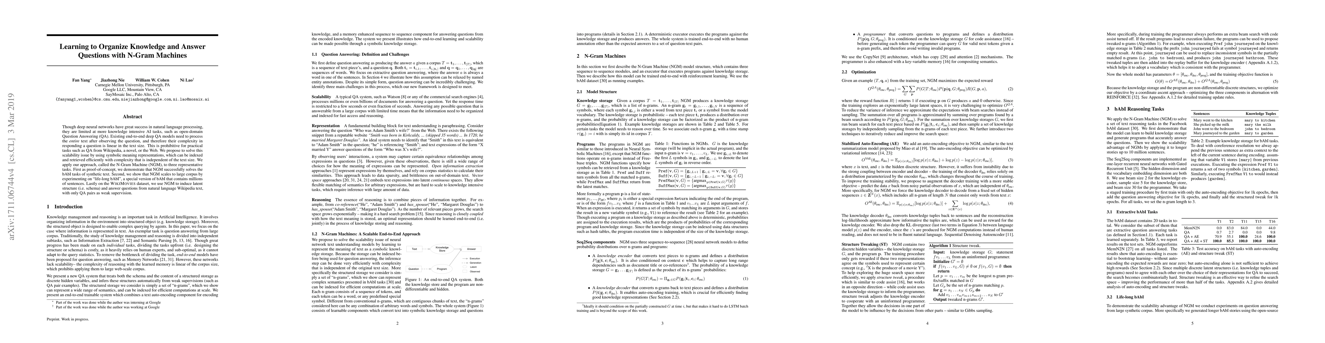 Though deep neural networks have great success in natural language processing, they are limited at more knowledge intensive AI tasks, such as open-domain Question Answering (QA). Existing end-to-end deep QA models need to process the entire text after observing the question, and therefore their complexity in responding a question is linear in the text size. This is prohibitive for practical tasks such as QA from Wikipedia, a novel, or the Web. We propose to solve this scalability issue by using symbolic meaning representations, which can be indexed and retrieved efficiently with complexity that is independent of the text size. We apply our approach, called the N-Gram Machine (NGM), to three representative tasks. First as proof-of-concept, we demonstrate that NGM successfully solves the bAbI tasks of synthetic text. Second, we show that NGM scales to large corpus by experimenting on "life-long bAbI", a special version of bAbI that contains millions of sentences. Lastly on the WikiMovies dataset, we use NGM to induce latent structure (i.e. schema) and answer questions from natural language Wikipedia text, with only QA pairs as weak supervision.