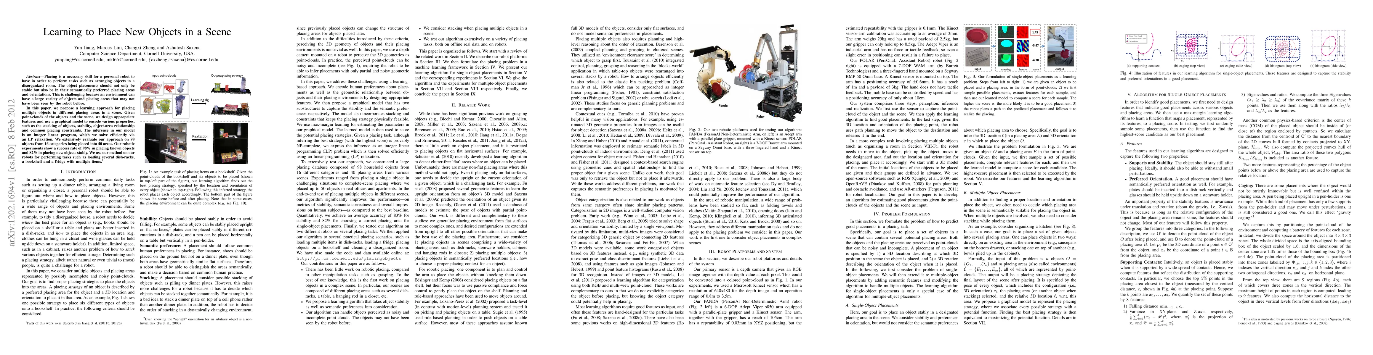 This paper proposes a learning approach for a robot to place multiple objects in various areas of a scene, focusing on stability and semantic preferences. The method uses point-clouds and a graphical model to encode object properties, achieving a 98% success rate for known objects and 82% for new objects in robotic experiments.