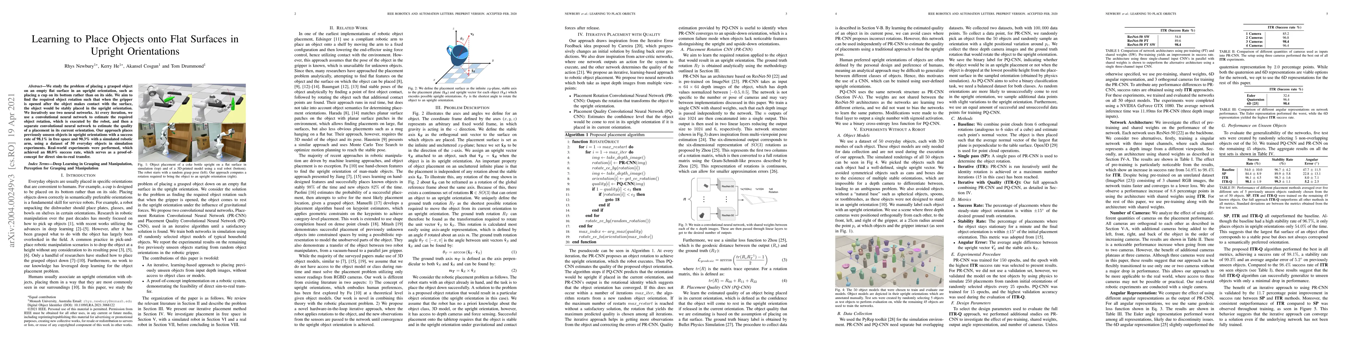 This research develops a neural network approach to enable robots to place objects upright on flat surfaces, achieving a 98.1% success rate in simulation and 88.0% in real-world tests, demonstrating effective sim-to-real transfer.