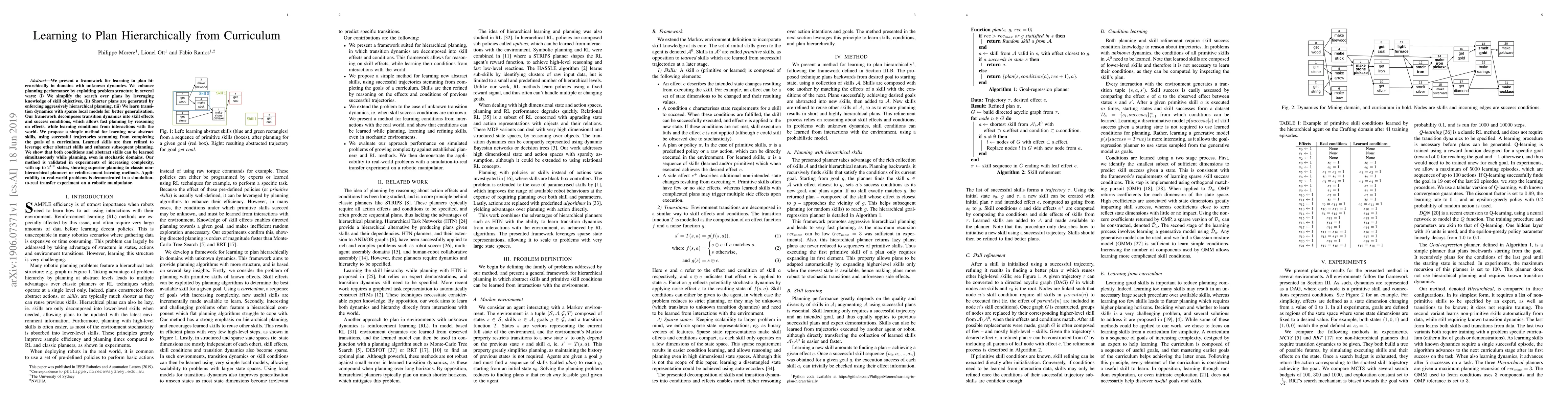 We present a framework for learning to plan hierarchically in domains with unknown dynamics. We enhance planning performance by exploiting problem structure in several ways: (i) We simplify the search over plans by leveraging knowledge of skill objectives, (ii) Shorter plans are generated by enforcing aggressively hierarchical planning, (iii) We learn transition dynamics with sparse local models for better generalisation. Our framework decomposes transition dynamics into skill effects and success conditions, which allows fast planning by reasoning on effects, while learning conditions from interactions with the world. We propose a simple method for learning new abstract skills, using successful trajectories stemming from completing the goals of a curriculum. Learned skills are then refined to leverage other abstract skills and enhance subsequent planning. We show that both conditions and abstract skills can be learned simultaneously while planning, even in stochastic domains. Our method is validated in experiments of increasing complexity, with up to 2^100 states, showing superior planning to classic non-hierarchical planners or reinforcement learning methods. Applicability to real-world problems is demonstrated in a simulation-to-real transfer experiment on a robotic manipulator.