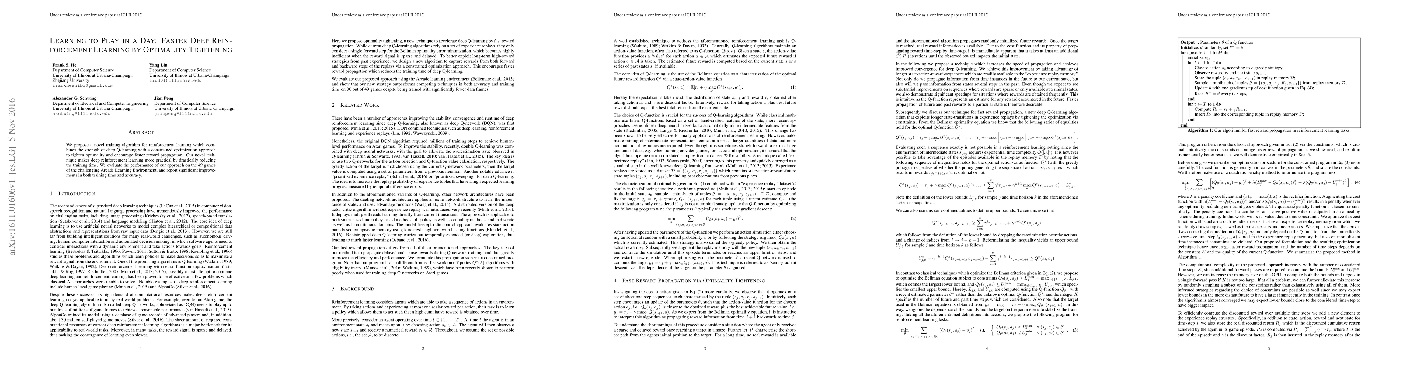 We propose a novel training algorithm for reinforcement learning which combines the strength of deep Q-learning with a constrained optimization approach to tighten optimality and encourage faster reward propagation. Our novel technique makes deep reinforcement learning more practical by drastically reducing the training time. We evaluate the performance of our approach on the 49 games of the challenging Arcade Learning Environment, and report significant improvements in both training time and accuracy.