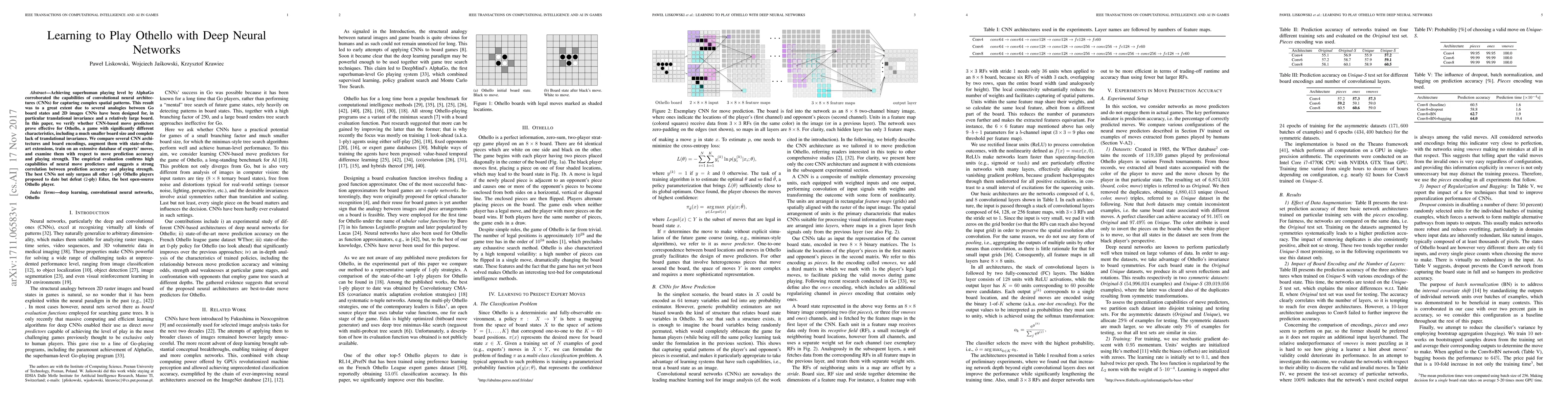 Deep neural networks excel at predicting moves in Othello, a game with a smaller board size than Go, outperforming existing players and achieving strong correlation between prediction accuracy and playing strength.