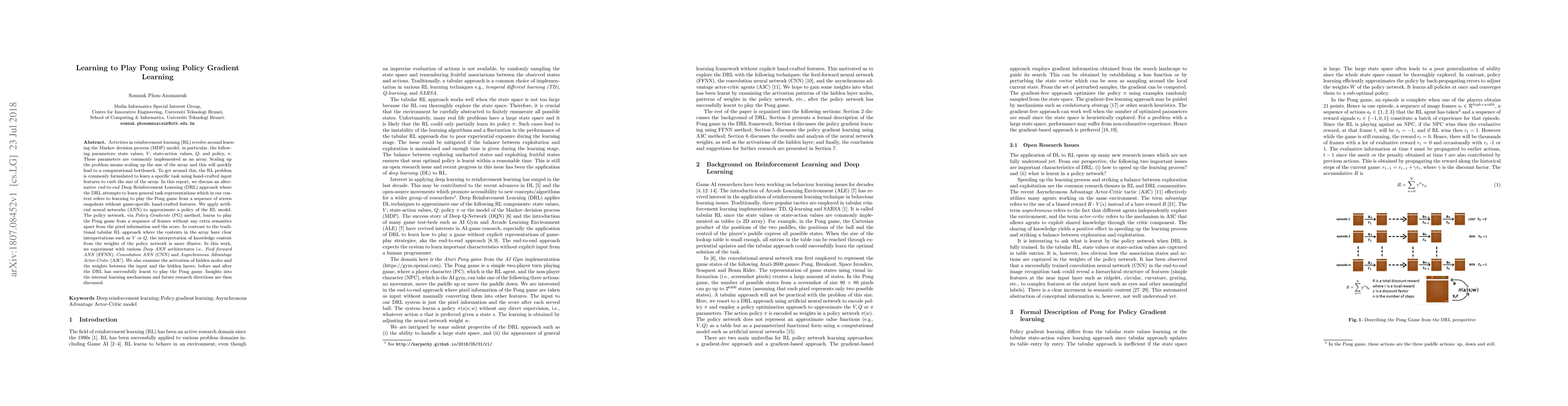 This paper presents an end-to-end Deep Reinforcement Learning (DRL) approach to teach a computer to play Pong using artificial neural networks. By learning directly from pixel information and scores, it avoids the need for hand-crafted game features. Various DRL architectures like Feed forward ANN, Convolution ANN, and Asynchronous Advantage Actor-Critic are tested. The study examines how the network learns by analyzing the activation of hidden nodes and weights, aiming to understand internal learning mechanisms and suggest future research directions.