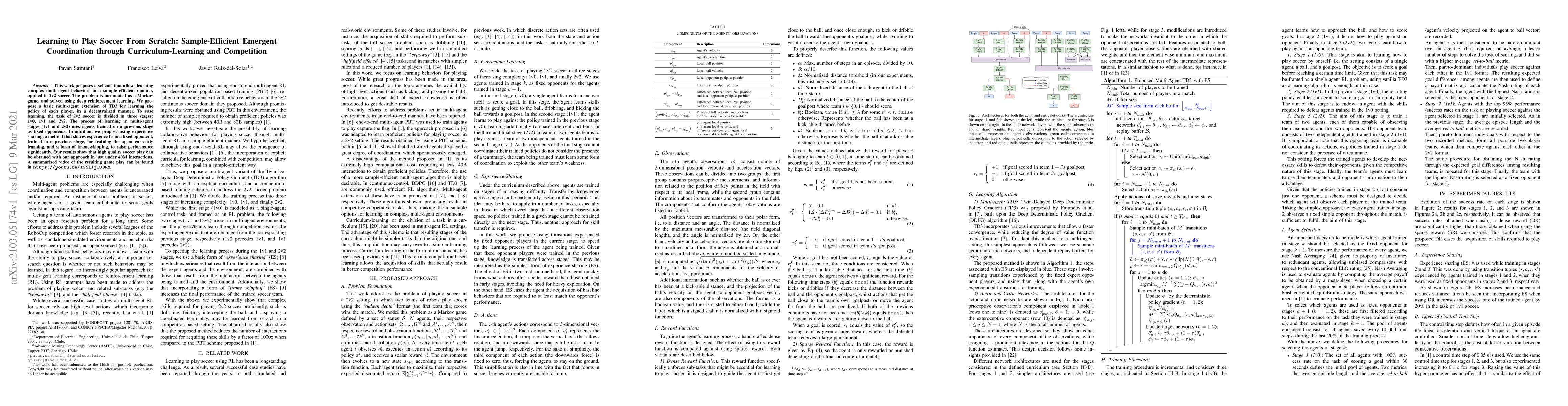 This work proposes a scheme that allows learning complex multi-agent behaviors in a sample efficient manner, applied to 2v2 soccer. The problem is formulated as a Markov game, and solved using deep reinforcement learning. We propose a basic multi-agent extension of TD3 for learning the policy of each player, in a decentralized manner. To ease learning, the task of 2v2 soccer is divided in three stages: 1v0, 1v1 and 2v2. The process of learning in multi-agent stages (1v1 and 2v2) uses agents trained on a previous stage as fixed opponents. In addition, we propose using experience sharing, a method that shares experience from a fixed opponent, trained in a previous stage, for training the agent currently learning, and a form of frame-skipping, to raise performance significantly. Our results show that high quality soccer play can be obtained with our approach in just under 40M interactions. A summarized video of the resulting game play can be found in https://youtu.be/f25l1j1U9RM.