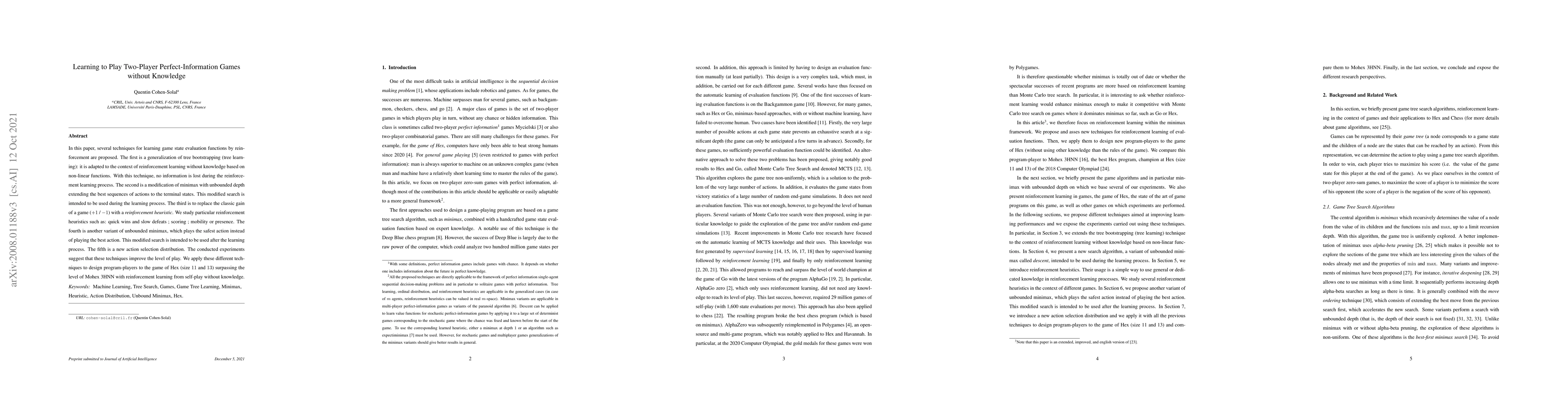In this paper, several techniques for learning game state evaluation functions by reinforcement are proposed. The first is a generalization of tree bootstrapping (tree learning): it is adapted to the context of reinforcement learning without knowledge based on non-linear functions. With this technique, no information is lost during the reinforcement learning process. The second is a modification of minimax with unbounded depth extending the best sequences of actions to the terminal states. This modified search is intended to be used during the learning process. The third is to replace the classic gain of a game (+1 / -1) with a reinforcement heuristic. We study particular reinforcement heuristics such as: quick wins and slow defeats ; scoring ; mobility or presence. The four is another variant of unbounded minimax, which plays the safest action instead of playing the best action. This modified search is intended to be used after the learning process. The five is a new action selection distribution. The conducted experiments suggest that these techniques improve the level of play. Finally, we apply these different techniques to design program-players to the game of Hex (size 11 and 13) surpassing the level of Mohex 3HNN with reinforcement learning from self-play without knowledge.