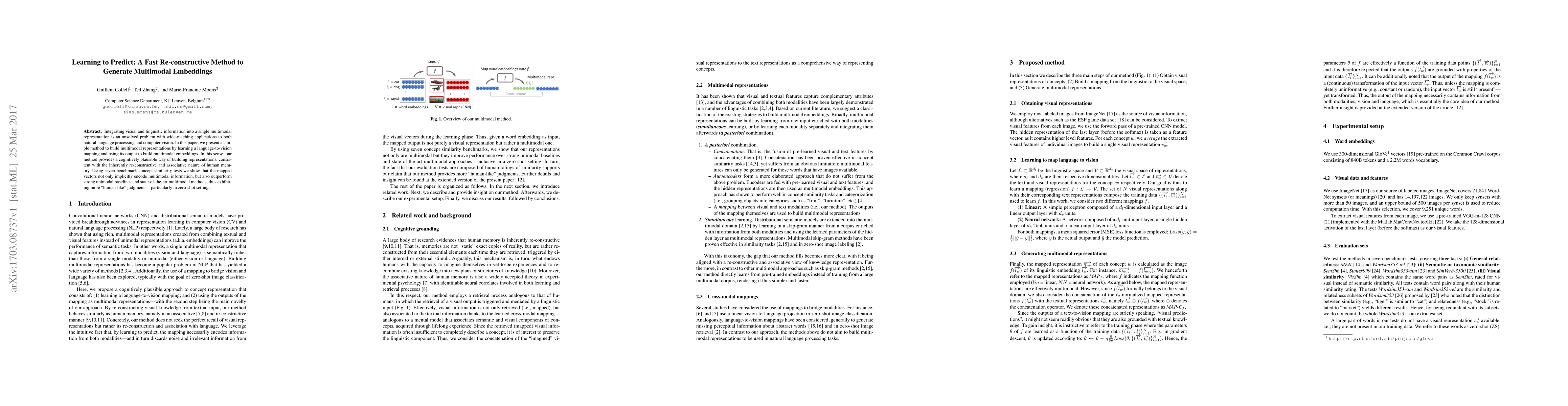 This paper introduces a fast re-constructive method for generating multimodal embeddings by learning a language-to-vision mapping, which outperforms unimodal baselines and existing multimodal techniques. The method demonstrates "human-like" judgments, especially in zero-shot settings, through benchmark tests.