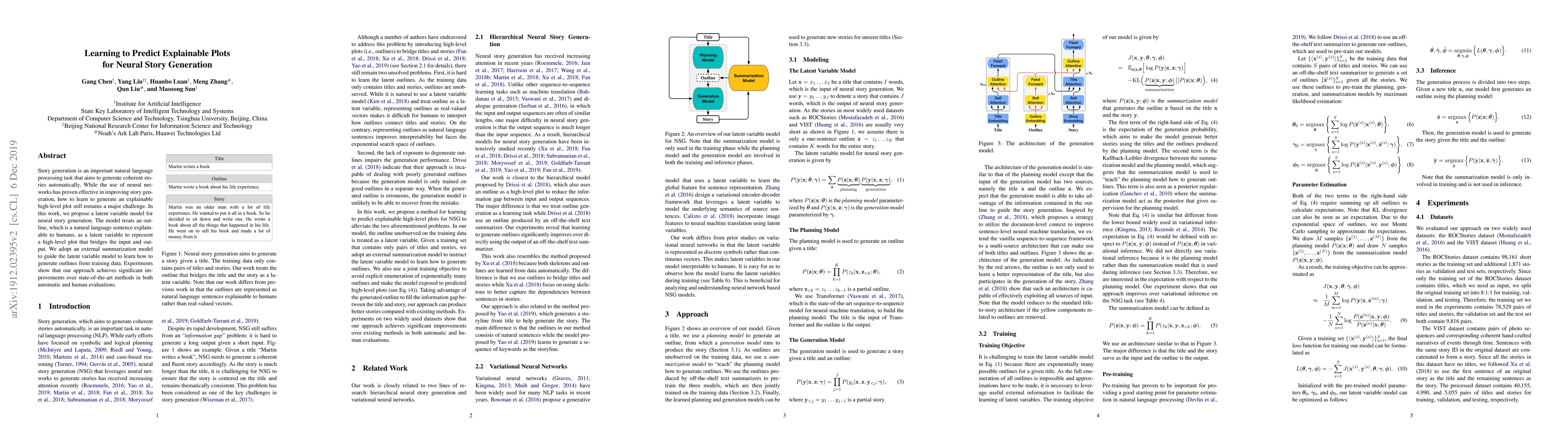 This paper proposes a latent variable model for neural story generation that uses an outline as a latent variable to create explainable high-level plots, guided by an external summarization model. The approach shows significant improvements over existing methods in both automatic and human evaluations.