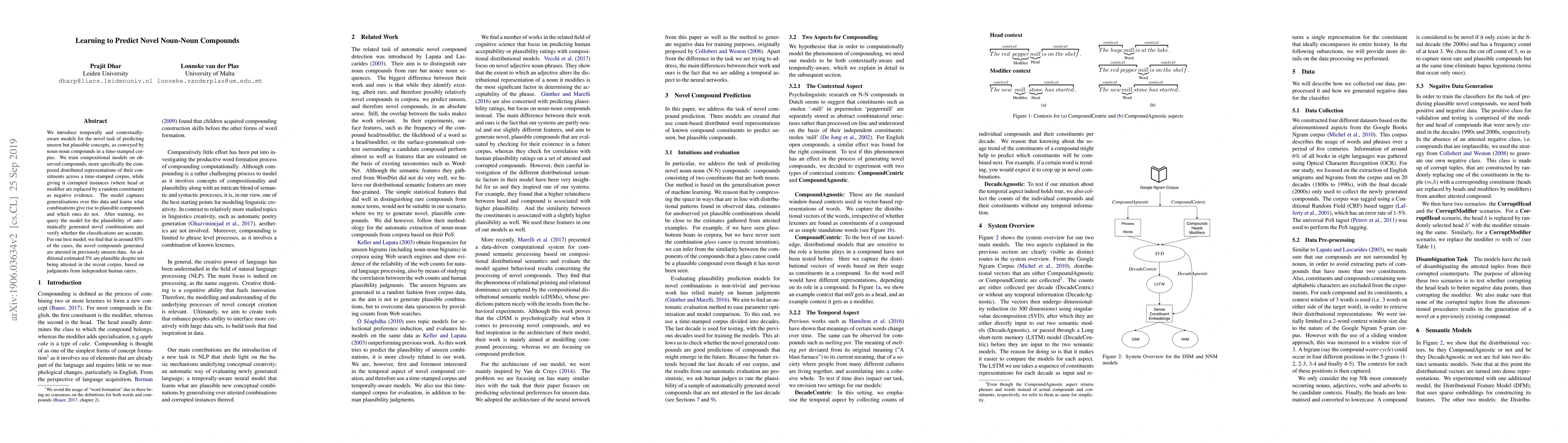 We introduce temporally and contextually-aware models for the novel task of predicting unseen but plausible concepts, as conveyed by noun-noun compounds in a time-stamped corpus. We train compositional models on observed compounds, more specifically the composed distributed representations of their constituents across a time-stamped corpus, while giving it corrupted instances (where head or modifier are replaced by a random constituent) as negative evidence. The model captures generalisations over this data and learns what combinations give rise to plausible compounds and which ones do not. After training, we query the model for the plausibility of automatically generated novel combinations and verify whether the classifications are accurate. For our best model, we find that in around 85% of the cases, the novel compounds generated are attested in previously unseen data. An additional estimated 5% are plausible despite not being attested in the recent corpus, based on judgments from independent human raters.