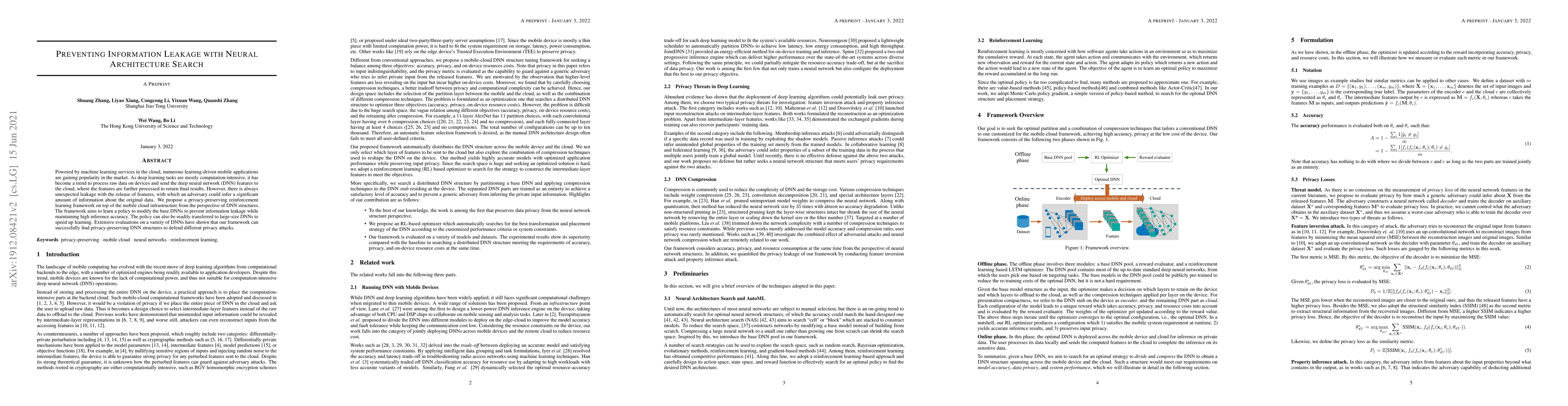 This paper proposes a privacy-preserving reinforcement learning framework to modify deep neural network (DNN) structures in mobile cloud systems to prevent information leakage while maintaining high inference accuracy. Extensive evaluations demonstrate the framework's effectiveness in defending against various privacy attacks.