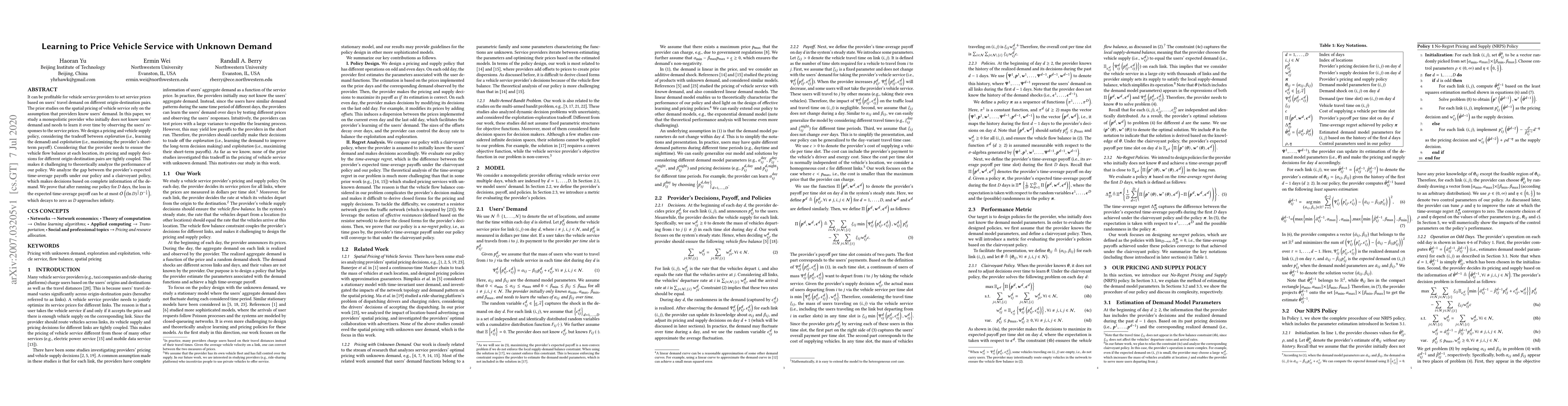 This paper develops a pricing and supply strategy for a vehicle service provider that learns users' demand over time without initial knowledge. It analyzes the trade-off between exploring demand and exploiting known demand to maximize profits, proving that the performance gap diminishes as the provider gains more information.
